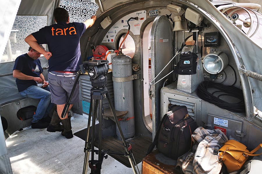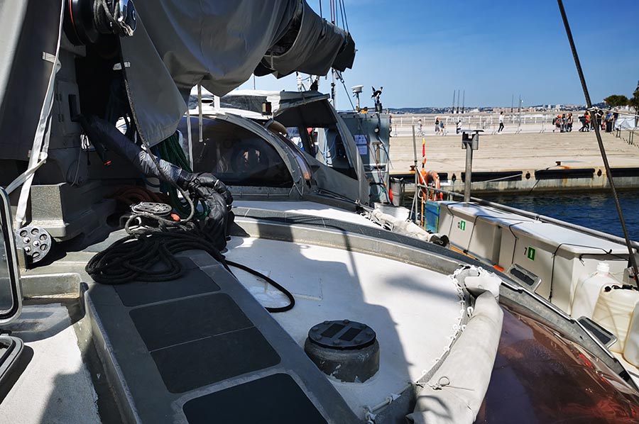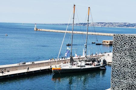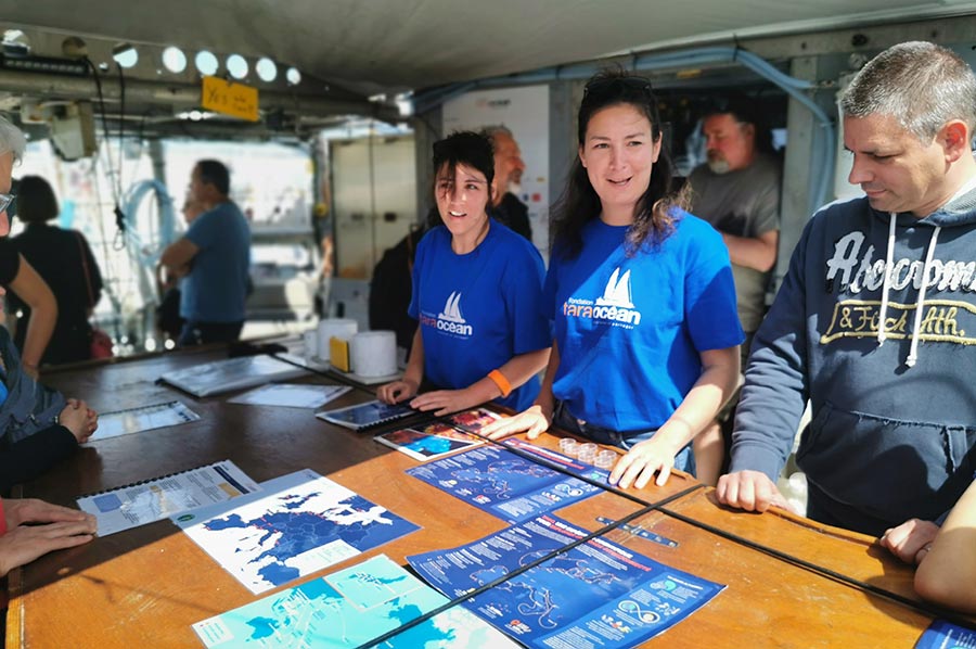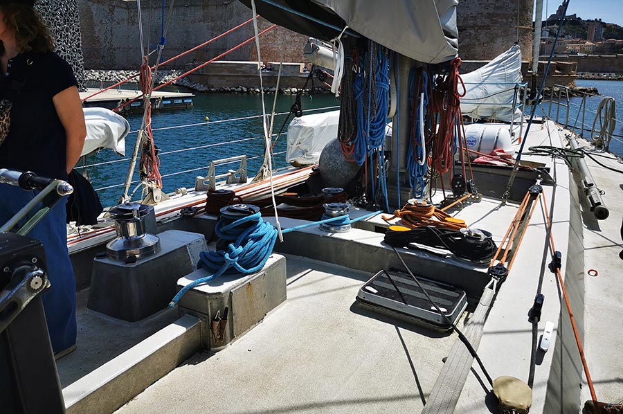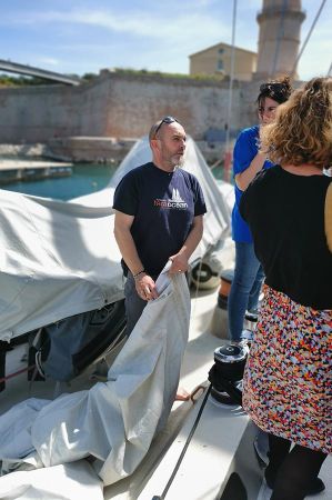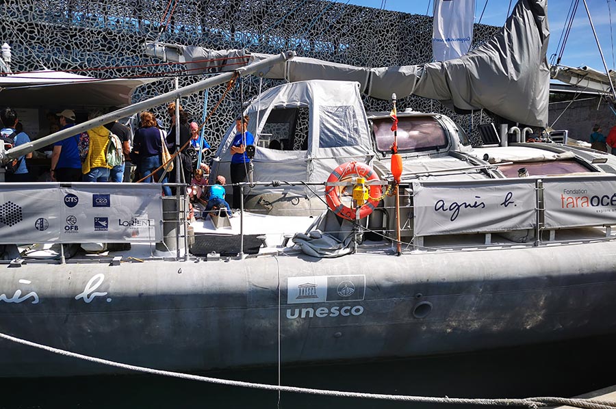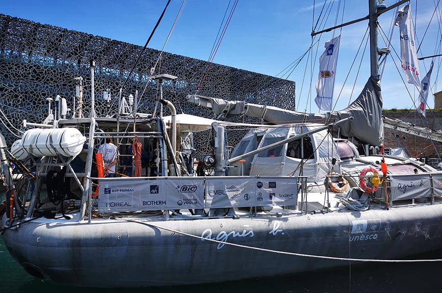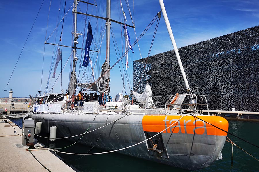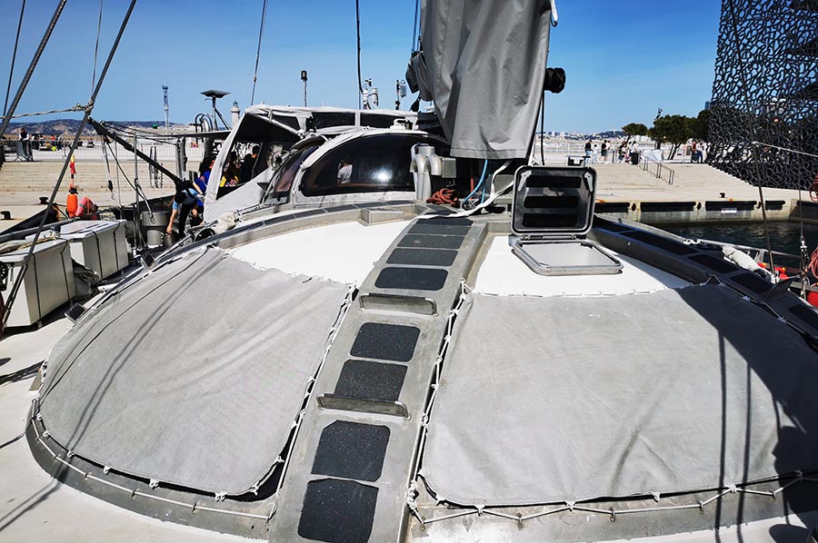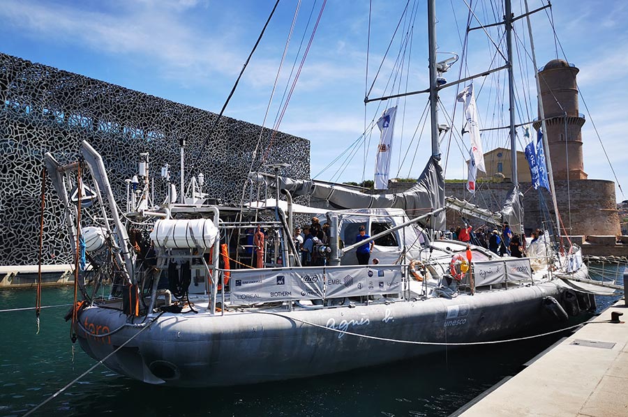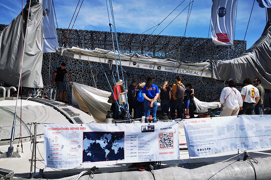 Vor etwa 15 Jahren hatten wir einen Artikel gelesen, als dieses Schiff zu Forschungsfahrten an den Küsten von Grönland, Südgeorgien und Patagonien unterwegs gewesen war und zwischen 2006 und 2008 als Eisdriftstation eingesetzt wurde. Vergleichbar wie einst Fridtjof Nansen wollte man so den Nordpol zu erreichen. Natürlich war unser Interesse geweckt. Wir bemerkten allerdings auch die Absperrungen und die diversen Fernsehteams, die auf und um das Schiff in dem kleinen Hafenbecken hinter dem Mucem Museum drehten. Nach einigen Fragen und etwas Recherche bei den Anwesenden Crew-Mitgliedern kam uns weiterer Zufall zur Hilfe, denn es waren Besuchergruppen zur Schiffsbesichtigung über zwei Tage angemeldet, wobei eine Gruppe nicht rechtzeitig angekommen war. So hatten wir Gelegenheit, die Tara etwas genauer zu erkunden.