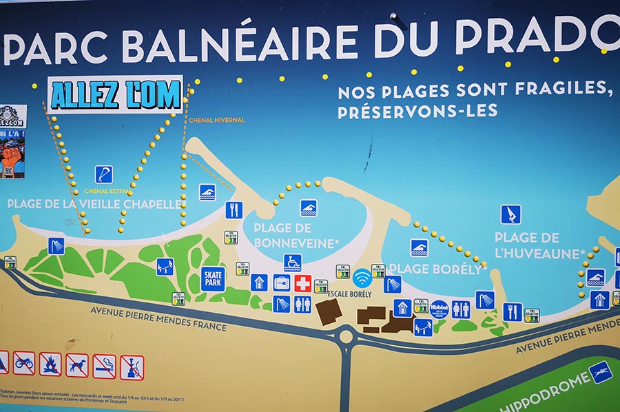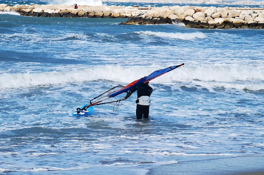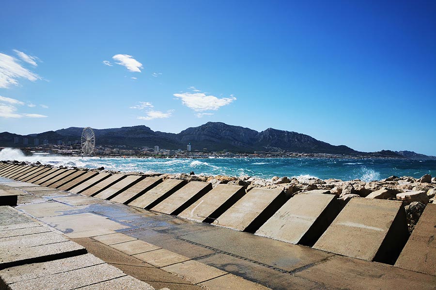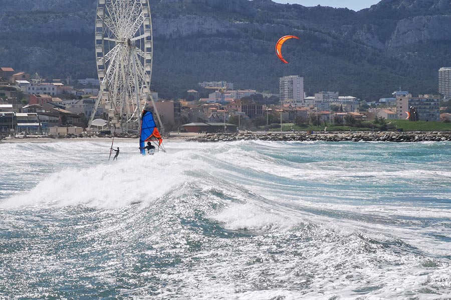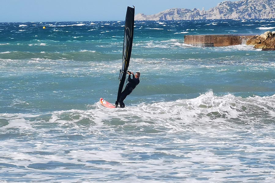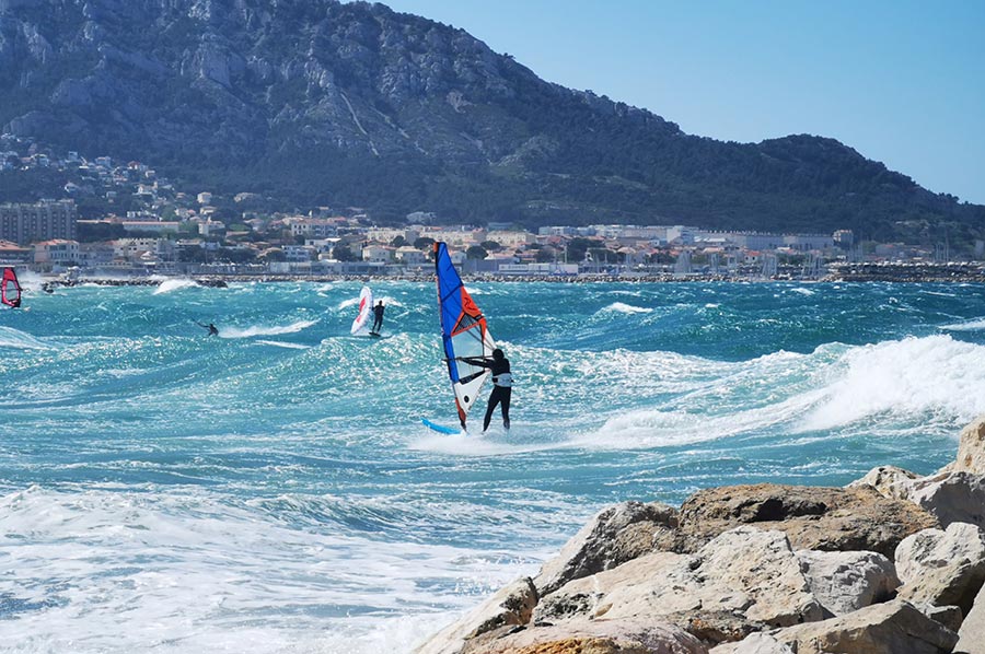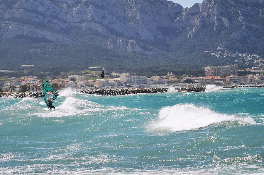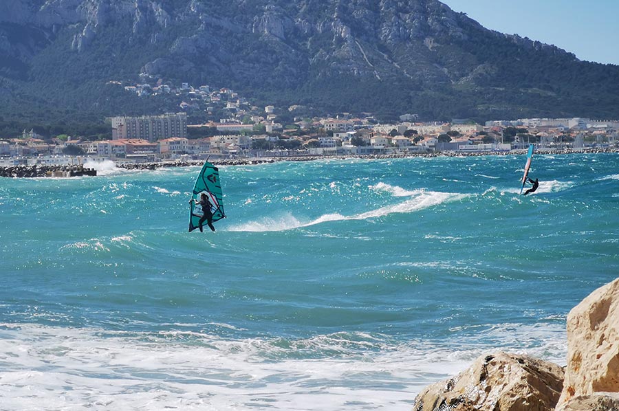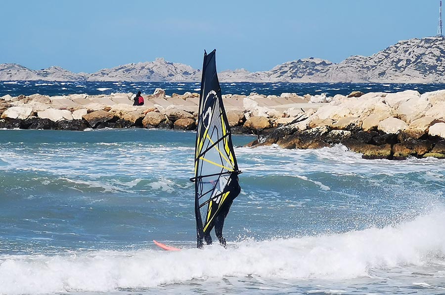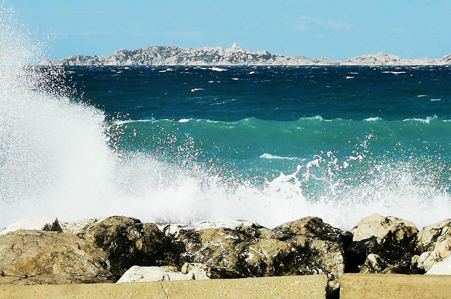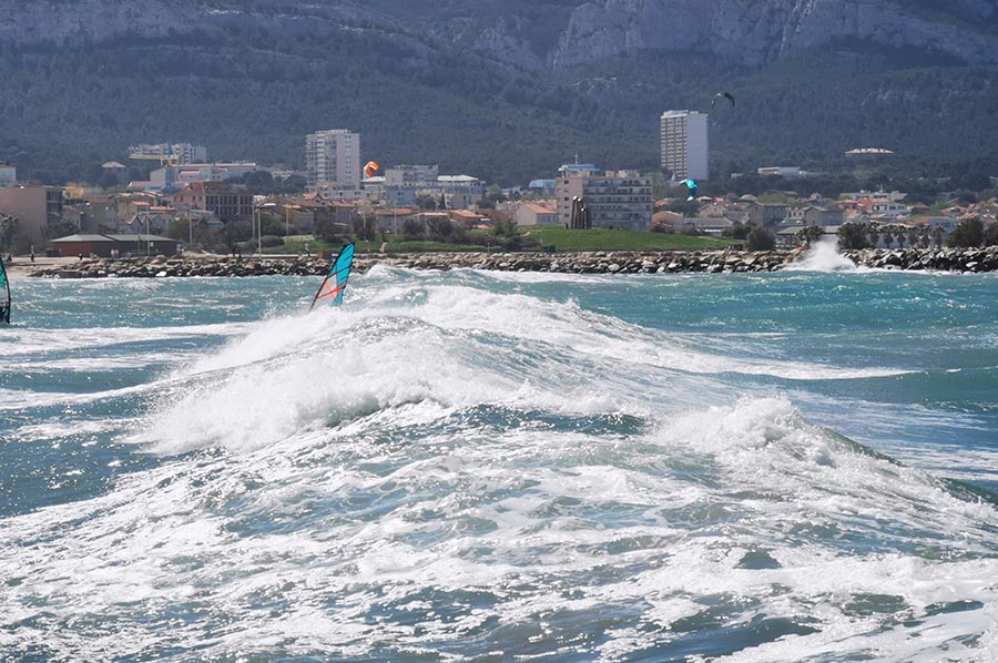Schon in Marseille hatten wir den aufkommenden Wind am Meer als heftig empfunden, trotz unserer Herkunft von der deutschen Nordseeküste mit gewohnter „Luftbewegung“. Wir waren trotzdem unterwegs in die Bucht Plage de Prado, zunächst mit der bereits angesprochenen Buslinie, dann weiter zu Fuß. Hier draußen, ohne den Schutz der städtischen Bebauung merkte man den Mistral schon wesentlich deutlicher. Der Mistral kann zuerst recht sanft und durch die Landmasse noch aufgewärmt und deshalb warm wehen. Nach einigen Stunden oder gar Tagen kann er sich zu einem starken bis stürmischen Wind entwickeln, der aus nordwestlicher Richtung über Frankreich in den Mittelmeerraum weht. Typisch ist dann ein wolkenloser, fast dunkelblauer Himmel, gute Fernsicht, nachts ein beeindruckender Sternenhimmel und ein erheblicher Abfall der Temperatur. Ein Prachtwetter für Kite-Surfer und Wellenreiter, so sollten wir in Kürze erfahren. Das Mittelmeer zeigt, dass es auch anders kann.