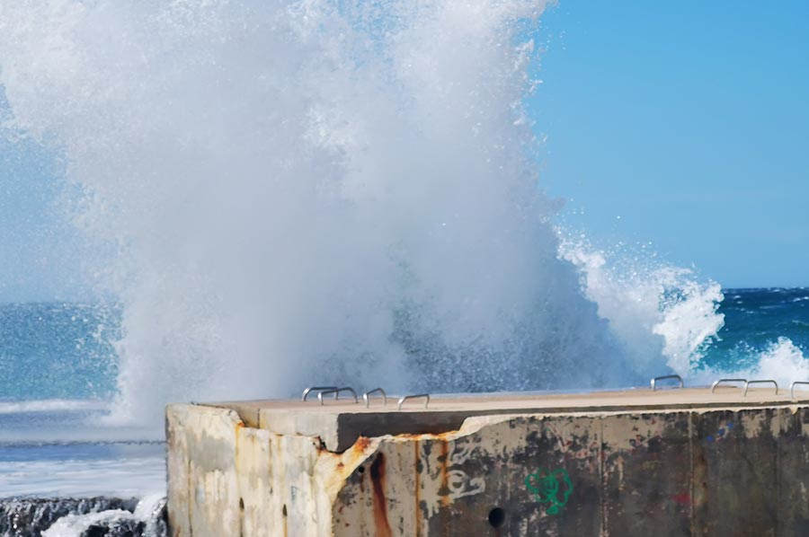 Hohe Wellen und peitschende Gischt am Strand von Prado