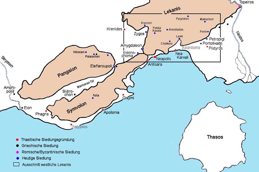 Von Neapolis, Nea Karvali und Pistyros aus drangen die Thasiten über die jeweils nach Norden führenden Flusstäler in die Bergregionen des Symvolon und vor allem in die Lekanis vor. Ziel waren Übernahme der dort von den Thrakern aufgeschlossenen und in Betrieb befindlichen Bergwerke und Verhüttungseinrichtungen, Aufschluss weiterer potentieller Edelmetall-Lagerstätten und die Sicherung der Zugangswege. Aufgrund der äußerst feindlich gesinnten thrakischen Bevölkerung, die heftigen Widerstand leistete, wie Archilochos, der persönlich an der ersten Landnahme beteiligt war, berichtet, scheinen es jedoch die Thasiten nicht geschafft zu haben, sich im Mamaras-Tal, zwischen Symvolon und Pangaion, anzusiedeln. Sie waren weder zu Zeiten Herodots (491–490 v. Chr.), noch später im 4. Jahrhundert stark genug, um in das schwer zugängliche und undurchdringliche, hohe Bergland des Pangaion einzudringen und sich dort festzusetzen. Selbst Xerxes ließ das Pangaion-Gebirge mit seinen Gold- und Silberbergwerken rechts liegen, das von Pierern und Otomantern, hauptsächlich aber von Satrern bewohnt wurde.