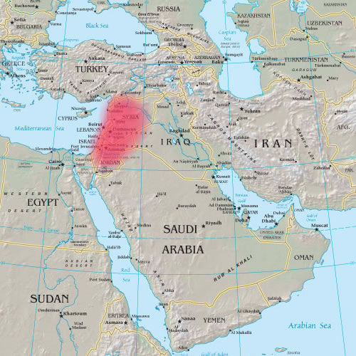 Die heutigen Staaten Syrien, Libanon, Israel, Jordanien sowie die palästinensischen Autonomiegebiete.