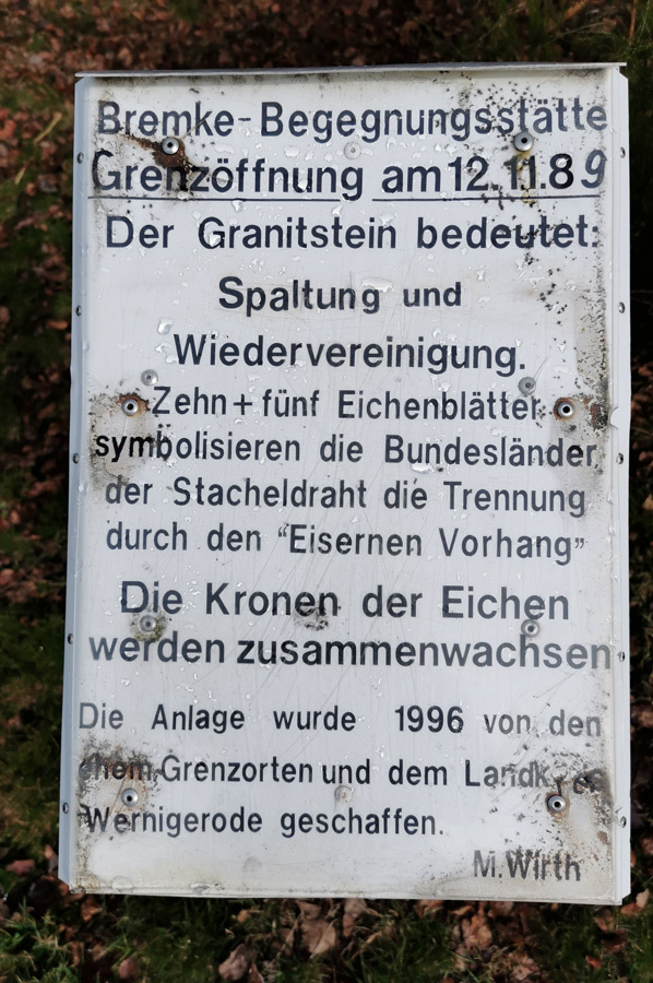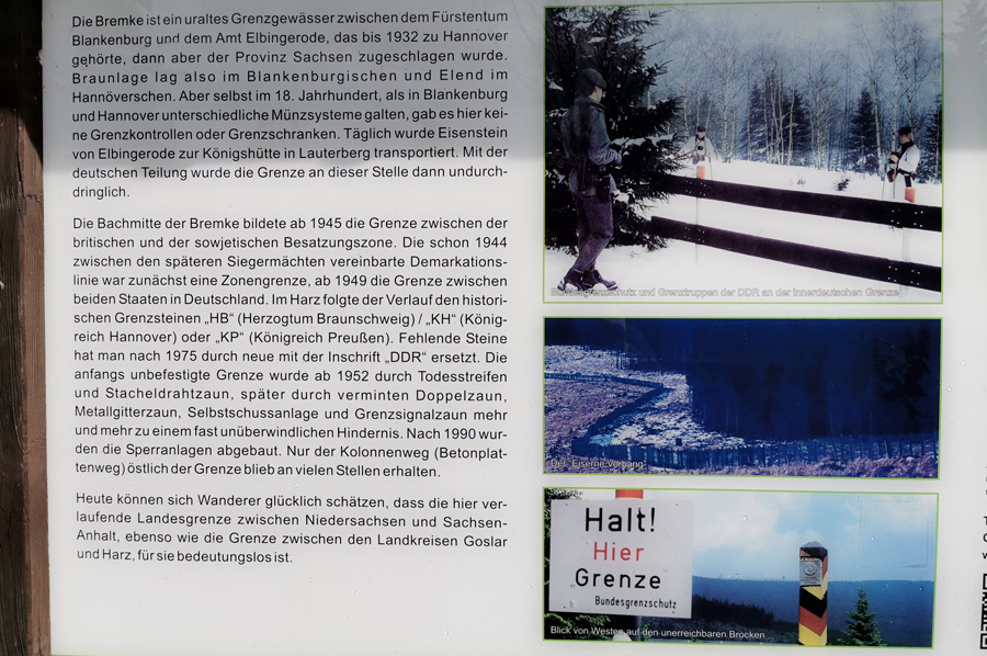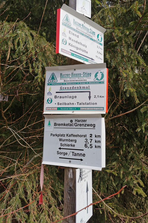 Noch ist die Erinnerung an die im Nichts endende Straße Richtung Sorge und Tanne von vor der Wiedervereinigung gut in unserem Gedächtnis. An die deutsche Teilung und dann erfolgte Wiedervereinigung erinnert allerdings hier ein recht zurückhaltendes Mahnmal an die ehemalige innerdeutsche Grenze, die hier zugleich die heutige Gemeindegrenze zwischen Braunlage und Elend bildet, unmittelbar neben der B 27. Unser heutiges Wanderziel war eben diese Grenzdenkmal, das wir von Schierke über das Harzer Bremketal / Grenzweg kommend erreichen wollten, eine Wanderstrecke von knapp 7 Kilometern. Heute ist auch Schierke, unser Ausgangspunkt, ein touristisch bedeutsamer Ort geworden, da Schierke auch als ein Anstiegsort für Wanderungen auf den Brocken bestens bekannt ist (Wir hatten bereits darüber berichtet, allerdings eine Wanderung bei eisiger Kälte im Winter).