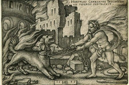 Auch die schwierigste Aufgabe, den Höllenhund Kerberos aus der Unterwelt zu entführen, meistert Herakles.Hades erlaubt die zeitweilige Entfernung des Ungeheuers, wenn Herakles auf seine Waffen verzichtet. Tatsächlich kann er in einem gigantischen Ringkampf die Bestie überwältigen und gefesselt zu Eurystheus bringen.