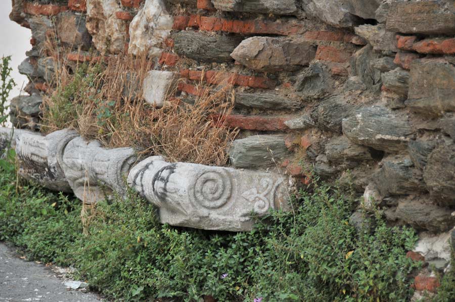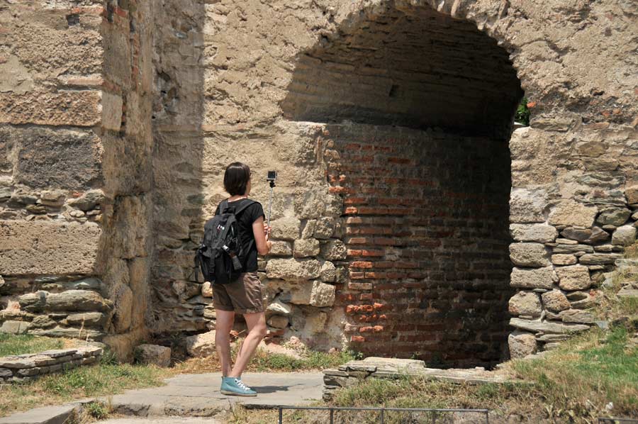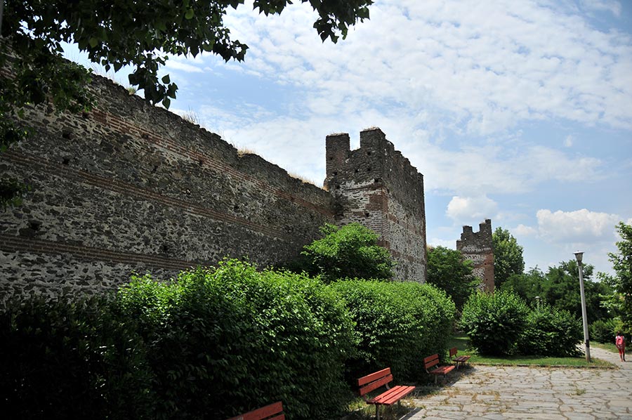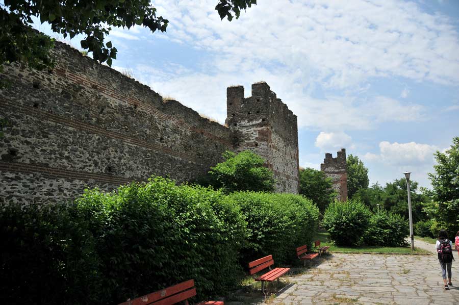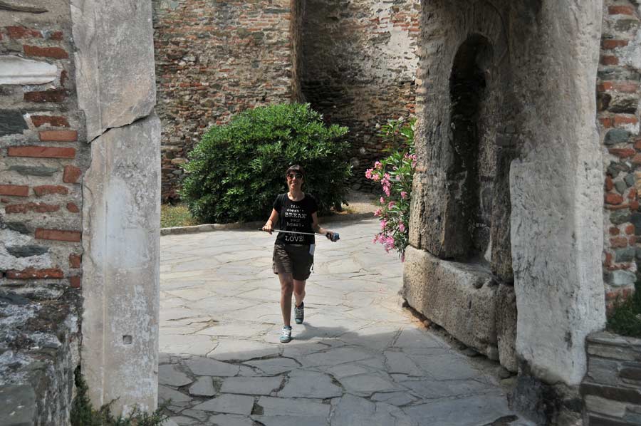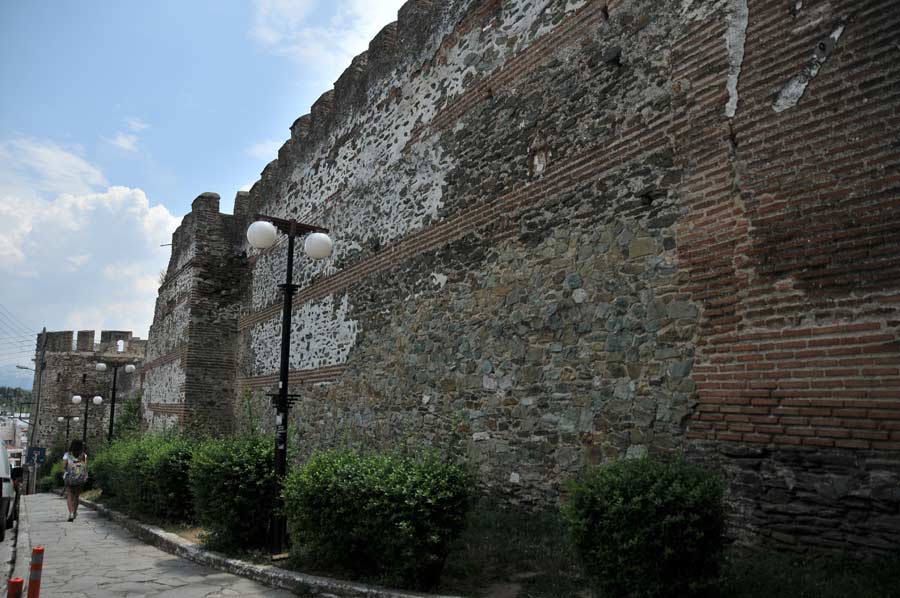 Im oberen Teil der Altstadt gelangen wir schon wenig später an die ersten Reste der ehemals so gewaltigen Stadtmauer von Thessaloniki. Der Spaziergang entlang der Stadtmauer und hin und wieder durch die engen Gassen der oberen Altstadt ist ein echtes Erlebnis, denn immer wieder stößt man auf kleine, absolut überraschende Blickpunkte, die den Weg trotz kontinuierlichen Anstiegs so interessant macht (ein kleines Cafe verlockt uns zu einer kurzen Unterbrechung mit eisgekühlten Frappé. Griechischer Café frappé, meist kurz Frappé genannt, ist ein Kaltgetränk aus durch Schütteln oder Mixen aufgeschäumtem sprühgetrockneten griechischen Instantkaffee mit Eiswürfeln. Er wird, wie Eiskaffee, meist im Sommer getrunken und ist vor allem im mediterranem Raum, besonders in Griechenland und Zypern, weit verbreitet).