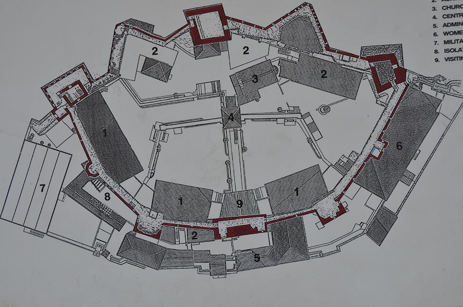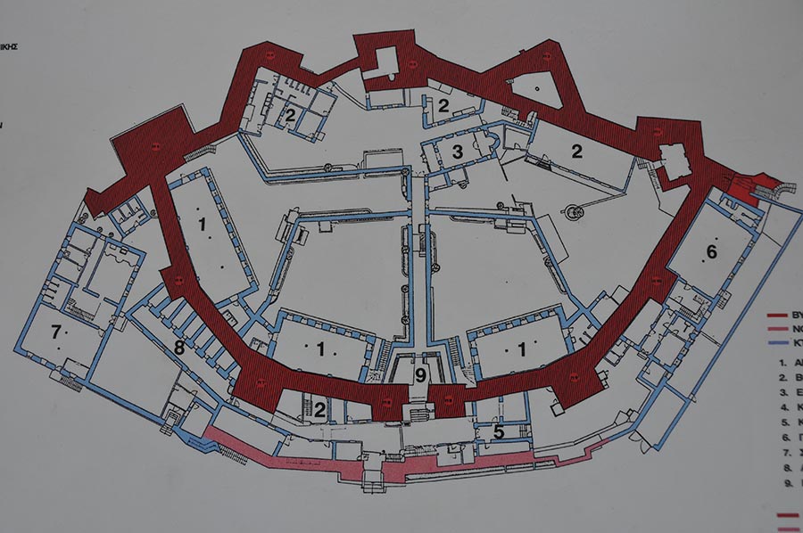 Wenig später und fast am höchsten Punkt der Akropolis und der byzantinische Befestigungsmauer angekommen, betreten wir die Akropolis durch eines von zwei Toren. Bis 1989 wurde ein Teil des Bauwerks mit ihrer Zitadelle noch als Gefängnis genutzt, das heute jedoch, nach ausgiebiger Restauration, nur noch als Gefängnis-Museum mit interessanten Einblicken in die Vergangenheit dient.