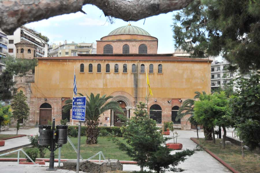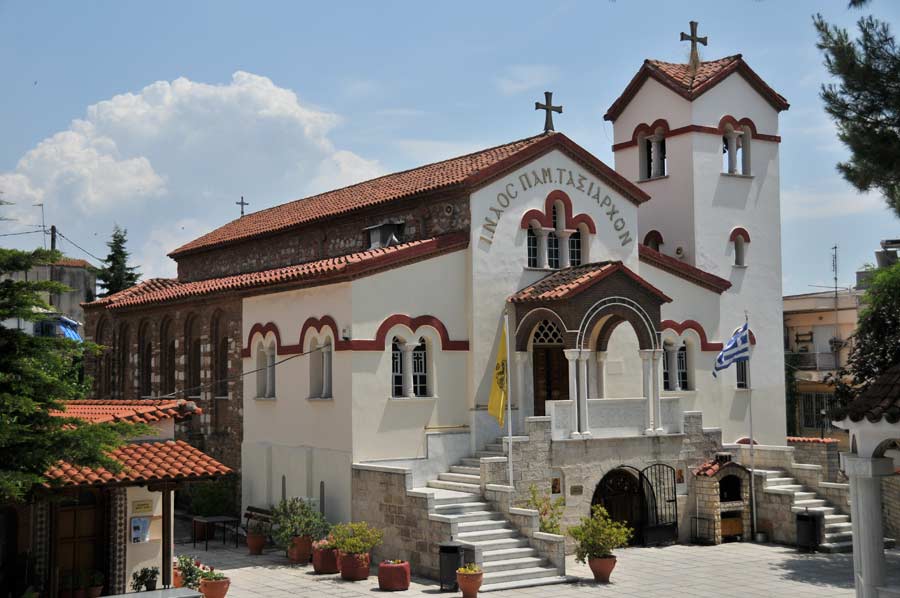 Auf das wohl berühmteste Gebäude der Altstadt, die fünfschiffige Basilika Agios Dimitrios, stoßen wir schließlich an der Odos Agiou Dimitriou, die die Altstadt von der Unterstadt abgrenzt. Wiederum von "Plattenbauten" umgeben, nimmt das monumentale, hellrote Gebäude aus dem 5. Jahrhundert eine Fläche von etwa 35 x 45 Metern ein und bietet von einem ihr vor gelagerten Platz aus eine beeindruckende Frontalansicht. Die Agios Dimitrios ist die größte Kirche Griechenlands. In ihrem Innern verbergen sich eine sehenswerte Krypta sowie einige bedeutsame Mosaike aus dem 7. bis 9. Jahrhundert, die zu den großen Schätzen frühchristlicher Kunst gehören.