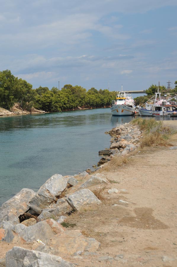 Unmittelbar nördlich des Ortes verläuft von West nach Ost der Kanal von Potidea, der uns als erstes mit seinem quellklaren, blau schimmernden Wasser überraschte. Schnell war der Gedanke gefasst, noch einmal mit dem Schlauchboot zurück zu kehren und den Kanal zu durchpaddeln.