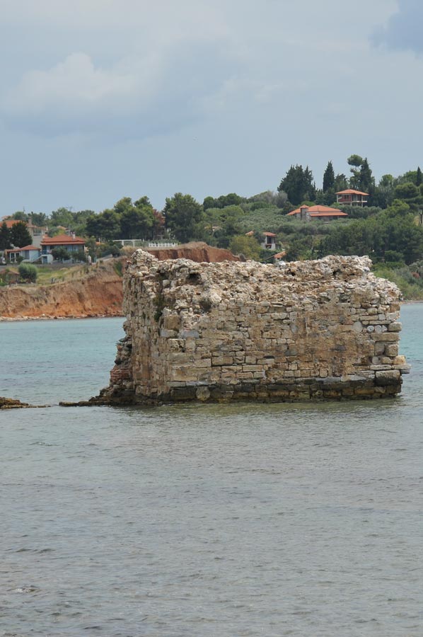 Wir sind direkt bis zum Fischereihafen gefahren, wo wir unser Fahrzeug abstellen konnten. Schon von weitem ist im Meer ein kleines Kastell sichtbar, das heute von den Wellen direkt an der Kanaleinfahrt von Potidea umspült wird. Das Kastell stammt aus der römischen Zeit.