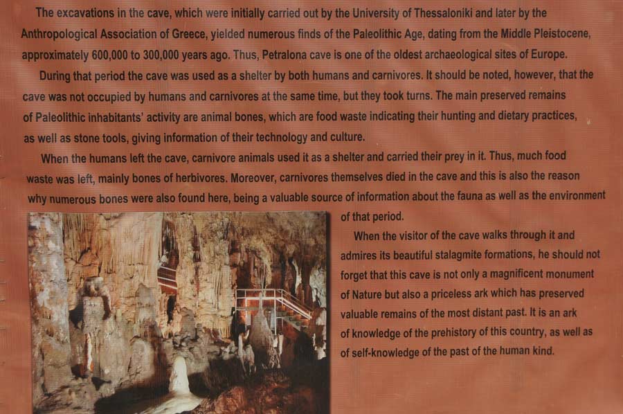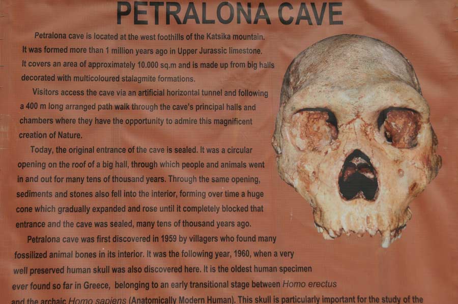 In der gesamten Höhle von Petralona darf weder fotografiert noch gefilmt werden, deshalb können auch wir keine Fotos aus dem Inneren der Höhle anbieten, allerdings den Besuch der Höhle durchaus empfehlen. Neben dem Höhlengang ein Museum, das Knochen, Zähne, Werkzeuge, Fossilien, etc. ausstellt, so auch die Kopie des Schädels des Homo heidelbergensis.