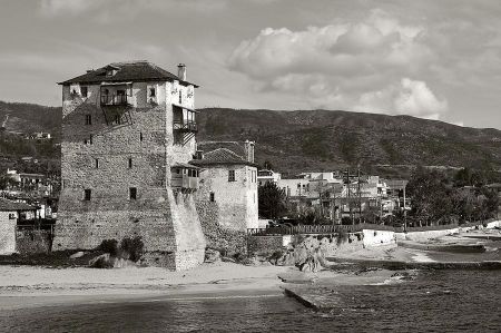 1344 erbaute das Kloster am Anleger einen riesigen Wehrturm, den Turm von Prosphorion, der noch heute das Wahrzeichen Ouranoupolis ist.