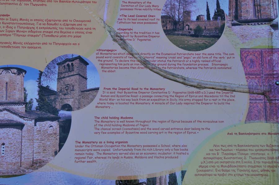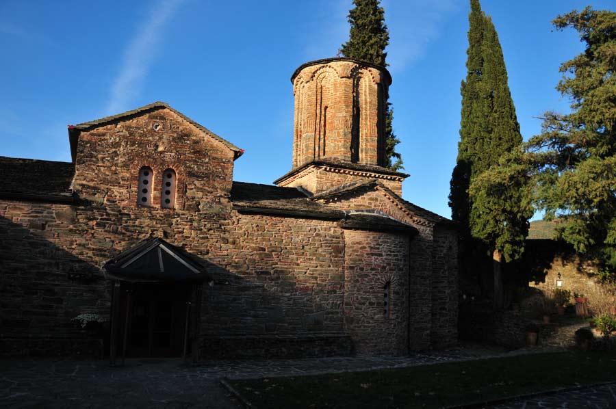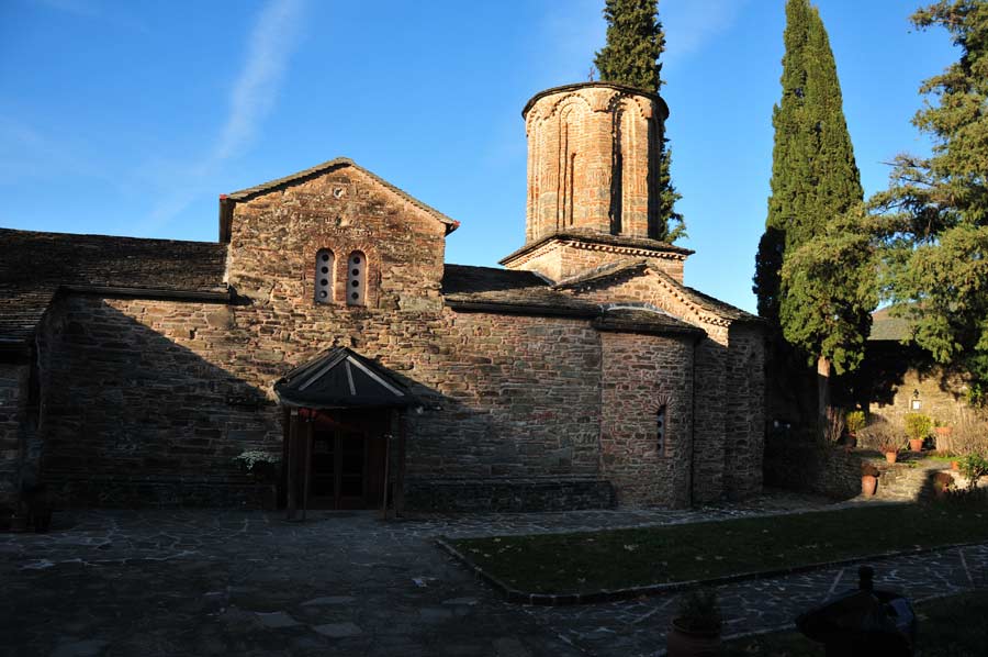 Die Abtei zeigt königliche Züge, weil sie in der Tradition der Region des Kaisers Konstantinos Pogonatos erbaut wurde, als der von einer Expedition auf Sizilien 671-672 v. Chr. zurückkehrte. Sieben Jahrhunderte später wurde er von Andronikos Palaiologos renoviert. Auf der westlichen Seite der Abtei sind Wandmalereien zu sehen, die die beiden Kaiser darstellen. Auch die Abtei wurde vom Patriarchat von Konstantinopel regiert. Leider ist das Fotografieren innerhalb der Klostermauern verboten.