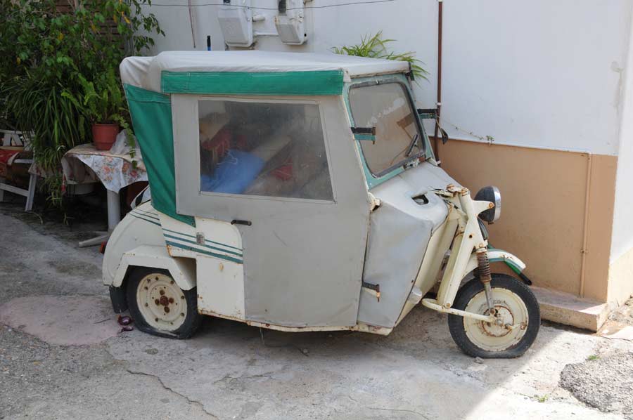 Schon der Blick hinüber von der Fähre zeigte eine sehr gebirgige Insel, die im Norden von zwei Bergmassiven dominiert wird: dem Pelinneo mit einigen Gipfeln von mehr als 1.000 Metern Höhe sowie dem Profitis Ilias, der mit seinen stolzen 1.297 Metern auch der höchste Berg von Chios ist. Die Berge der Amani im Nordwesten von Chios erreichen „nur“ Höhen von etwa 800 Metern. Wir waren jetzt ganz froh, zunächst ohne Auto gekommen zu sein, denn wir hatten noch keine Vorstellung hinsichtlich der Straßenqualität auf der Fahrt ins Innere der Insel, die in ihrer Mitte nur etwa 13 Kilometer breit ist. In der Längsrichtung vom Kap Masticho im Süden bis zum Kap Epanochoro im Norden sind es immerhin 51 Kilometer, die von der Stadt Chios kommend in beide Richtungen einige Serpentinen an den Bergen erwarten lässt.
