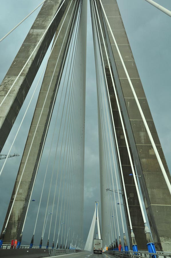 Rio-Andirrio - Nach unserem überraschend angenehmen und interessantem Zwischenstopp in Nafpaktos hatten wir aufgrund des drohenden Unwetters die Querung des Golfs von Korinth via Rio-Andirrio-Brücke beschlossen, wollten diesmal die doch wesentlich günstigere jedoch zeitaufwendigere Fährpassage meiden, auch, da unser Tagesziel mit Gythio noch in einiger Entfernung vor uns lag.
