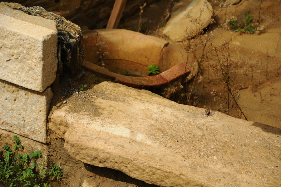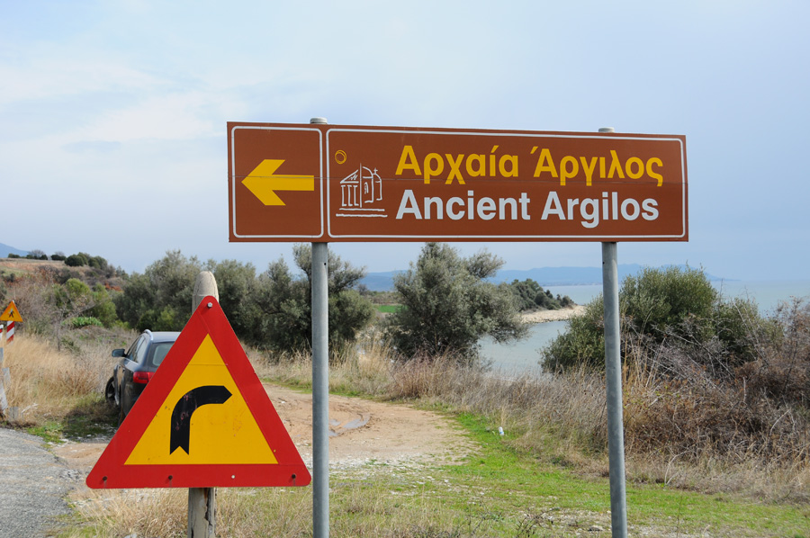 Wir sind auf dem Weg zum antiken Amphipolis, das in einem Bogen des Flusses Strymonas an der römischen Via Egnatia liegt und einst ein bedeutender Handelsplatz war, als uns ein Hinweisschild auf die Ausgrabungen des antiken Argilos hinweißt.