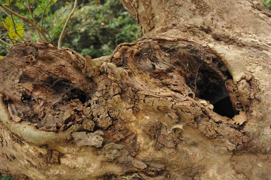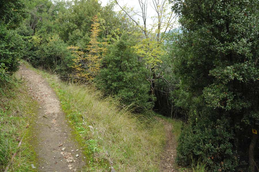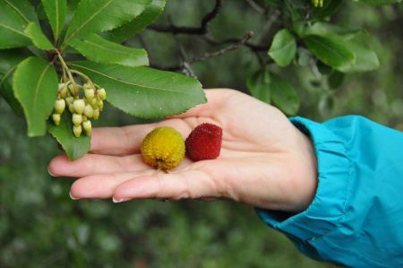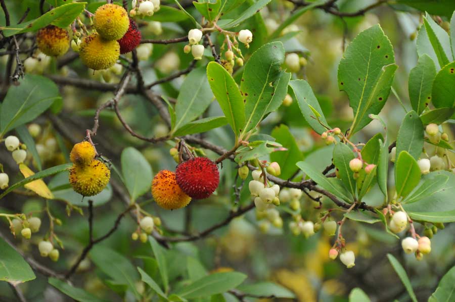 Wir fanden dann allerdings einen schmalen Pfad, der zunächst entlang der Burgmauer, so zumindest unser erster Eindruck, herum führen wird. Kurz entschlossen folgten wir diesem Pfad, der sich wenig später gabelte und hinunter zum Strand führen sollte. Wir machten uns an den teilweise rutschigen Abstieg, der besser in Wanderschuhen hätte bewältigt werden können. Immer lauter wurde das Rauschen des Meeres, dunkle Wolken kündigten zwar Regen an, aber es blieb trocken. Unterwegs stießen wir auf einige interessante Pflanzen, so auch auf Buschwerk, das alle Stufen der Vegetation zeigte: Blüten, kleine Fruchtstände, grüne Früchte und rote, reife Früchte. Trotz späterer Nachfrage konnten wir die Art nicht bestimmen. Vielleicht können Sie uns helfen.