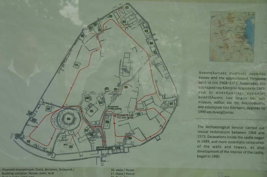 Leider stießen wir nach dem Anstieg auf einer leider in Griechenland vielerorts vorhandenes Problem, es war 14.55 Uhr und um 15.00 Uhr schloss die Besichtigungszeit. Eine sehr unerfreuliche Situation für Touristen, die sicherlich nicht Morgens bereits um 8.00 Uhr zur Burgbesichtigung kommen werden. Somit konnten wir zwar einen kurzen Blick in das Innere des Burghofes werfen, mehr Zeit war dann allerdings nicht mehr übrig. Schade.