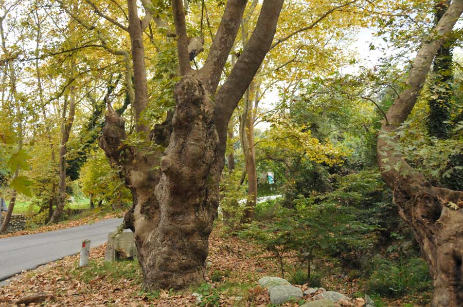 Unser Rückweg zum Fahrzeug verlief dann entlang einer wenig befahrenen Straße, die auch an einer Brunnenanlage vorbei führte. Hohe und uralte Platanen mit mächtig großen Laubmengen sorgten neben dem grauen Himmel für ein typisches Herbstbild. Ein kurzer, wenngleich interessanter Rundweg um die Burg von Platamonas war geschafft. Nun sollte es zur Destillation von Grappa in einen Betrieb vor Ort gehen. Zunächst war allerdings ein Zwischenstopp am neuen Camperstopp angesagt, allein um den baulichen Fortschritt zu begutachten. Und siehe da, die Hoffläche war planiert und auch die Steckdosen installiert. Die ersten Gäste können kommen.