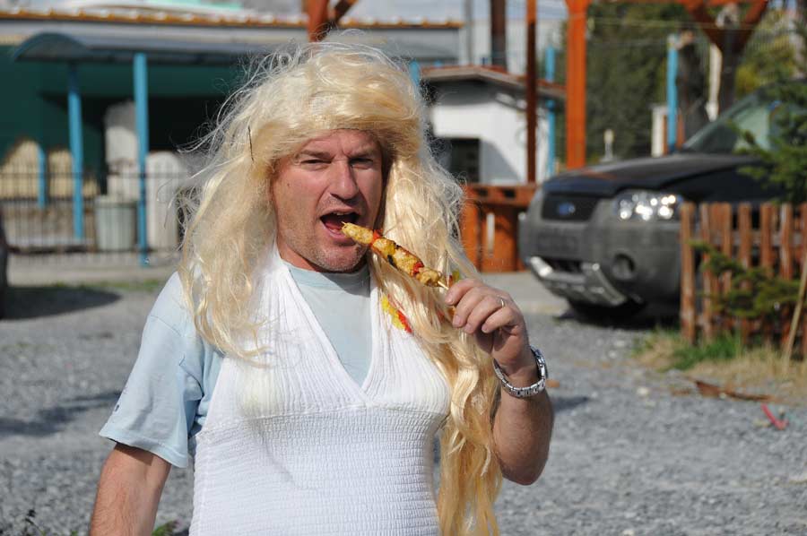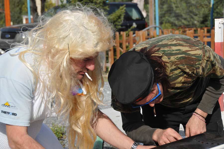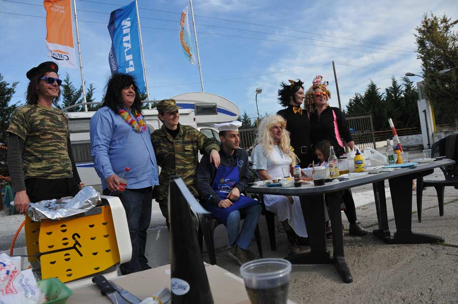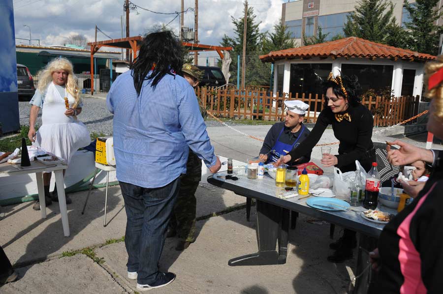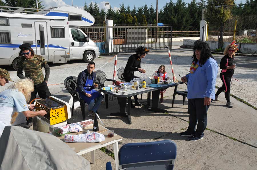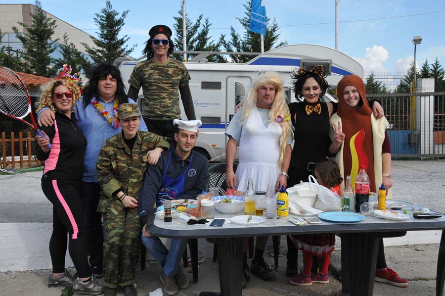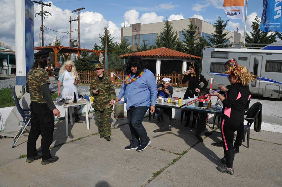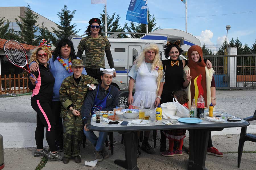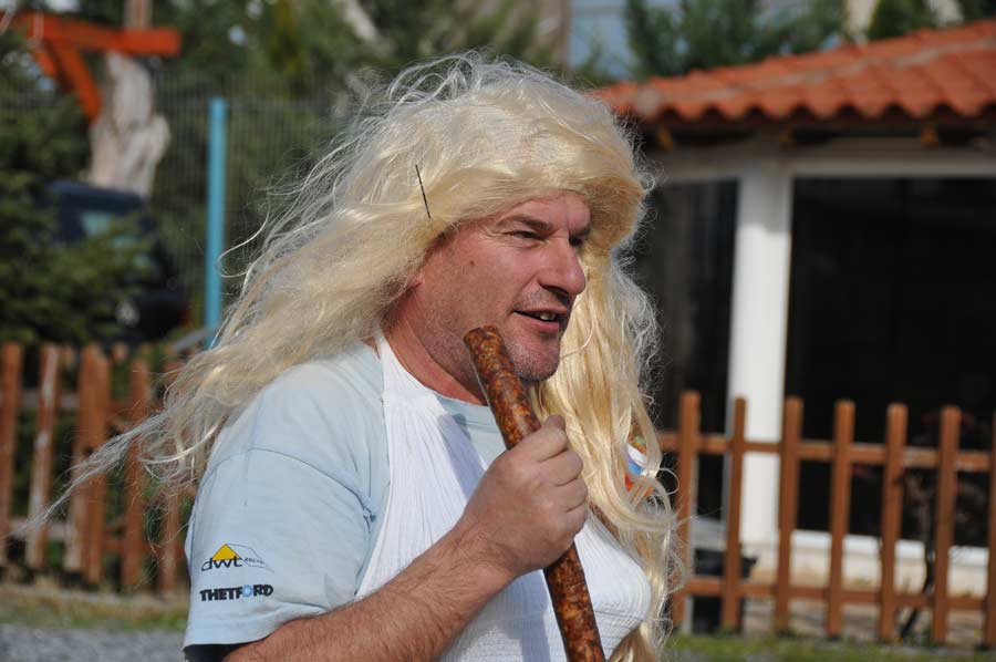 Bei Zampetas war am besagten Donnerstag folglich ein Grill, Tisch und Stühle vor den Geschäftsräumen aufgebaut worden, um den herum sich die verkleideten Mitarbeiter und deren Familienangehörige versammelt hatten. Als Gäste des Anwesens waren wir, zwar ohne Maskierung, schnell in die Feierlichkeiten integriert. Neben lecker gegrillten Fleisch- und Wurstwaren gab es leckere Salate und dazu passenden Wein.