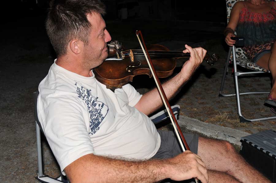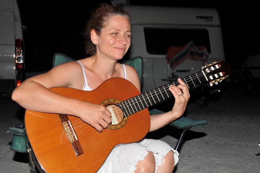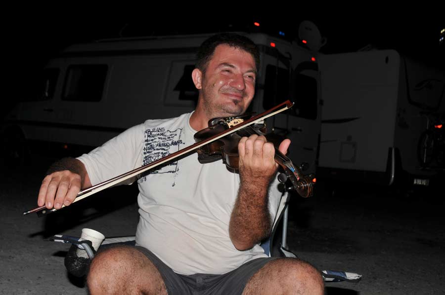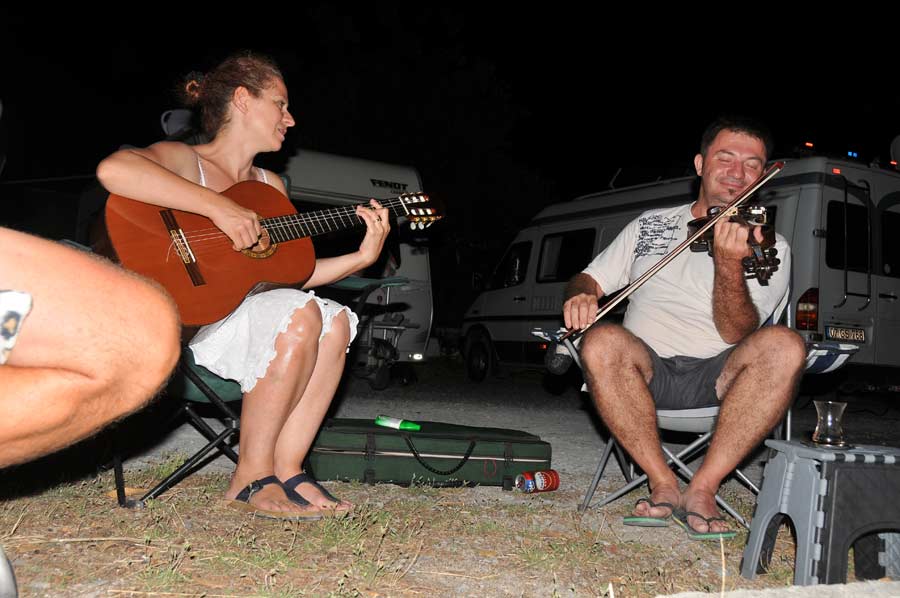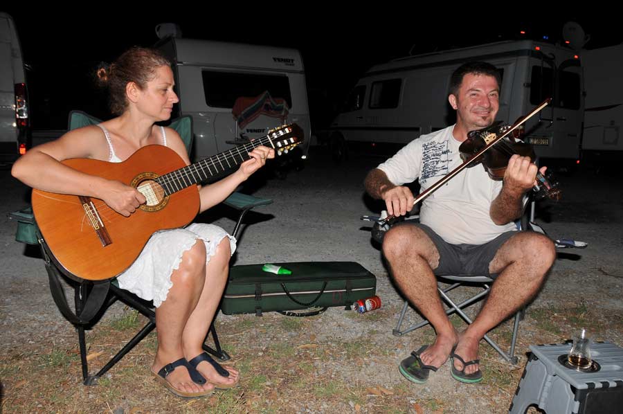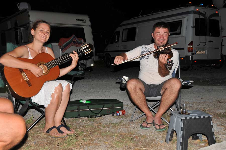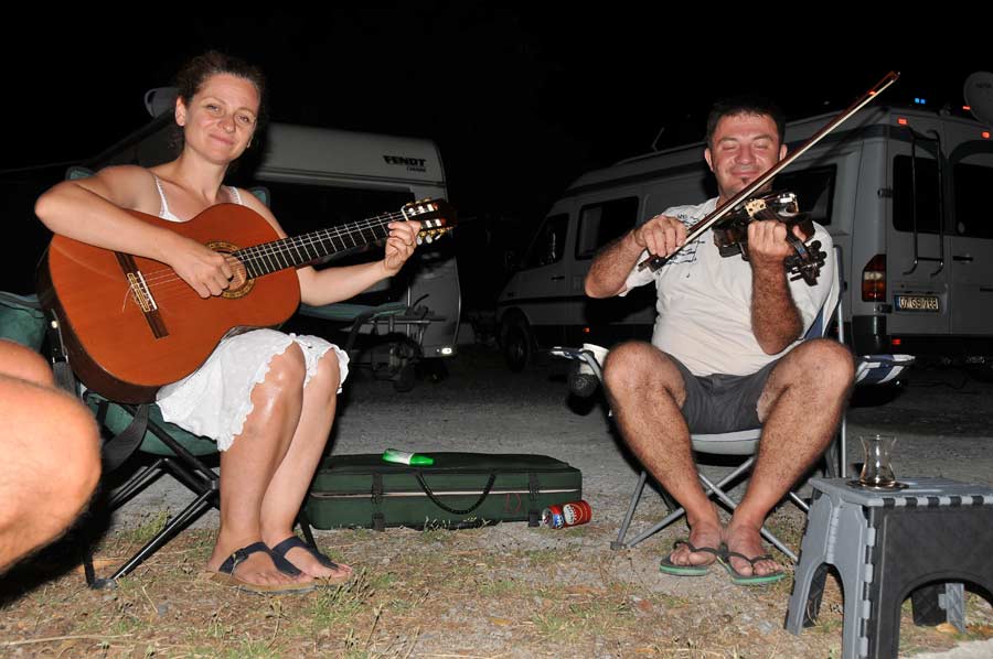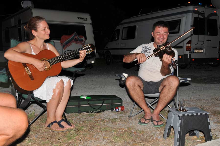 So wurde in der Campergemeinschaft mehrfach zusammen gegessen und dabei das Zuckerfest "gefeiert". Und so lernten wir auch Öslem und Bora kennen, ein Ehepaar aus Istanbul, das im selbst ausgebauten Campermobil zur Zeit gemeinsam mit ihrem Sohn Griechenland erkunden will. Das starke Interesse Boras an der Ausstattung seines Campers mit einer Photovoltaik Anlage hatte zum Besuch bei Zampetas geführt. Schon in den ersten Gesprächen hatten wir erfahren, das Özlem und Bora aktive Musiker sind, so das schnell auch der Wunsch nach musikalischen Vorträgen die Runde machte. Und einmal mehr zeigten sich die Beiden motiviert und spontan genug, nach dem Abendessen ihre Instrumente hervorzuholen und das eine oder andere international bekannte Liedgut zu präsentieren.