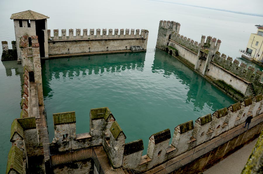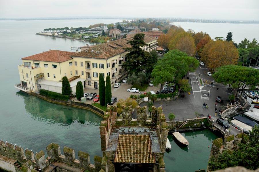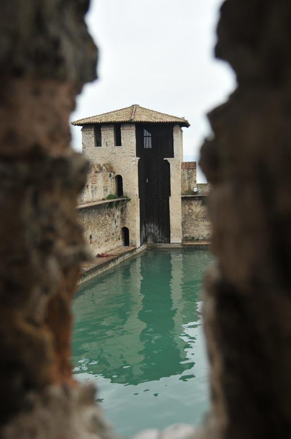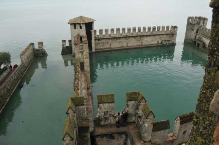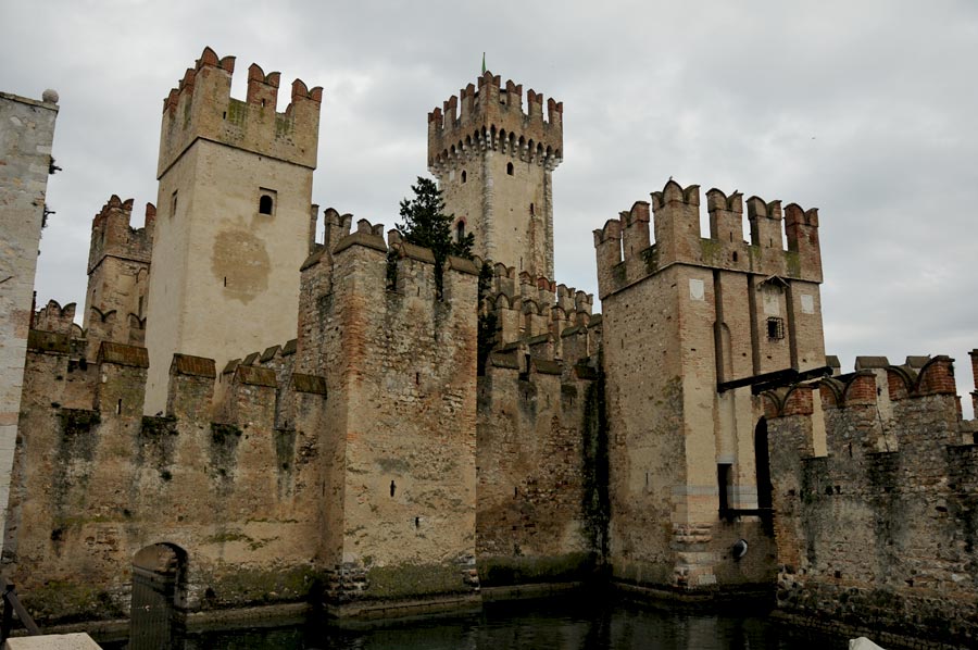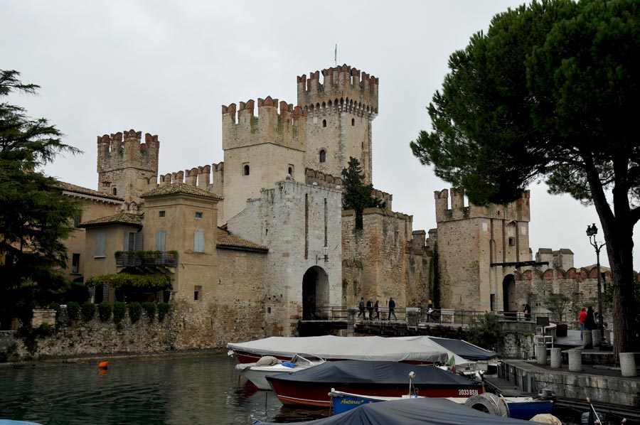 Gleich mehrere Zugbrücken, eine Ringmauer und zwei Hafenbecken trennten die Scaligerburg und damit diesen Stadtteil Sirmiones vom Festland ab. Der Klan der Scaliger baute aus dem seiner Zeit nur noch aus Ruinen bestehenden alten Römerkastell ab 1259 auf dem ersten der drei Hügel diese schon wehrhaft aussehende Burg mit den typischen Schwalbenschwanzzinnen, die direkt am Wasser liegt und dem innen liegenden Hafen einst der Gardasee-Flotte Schutz bot.