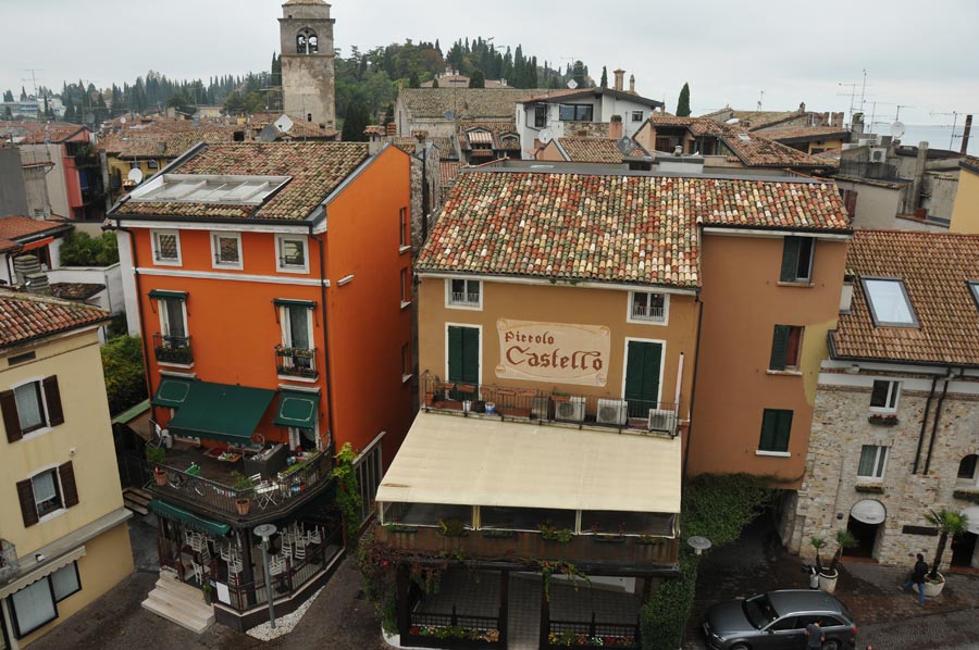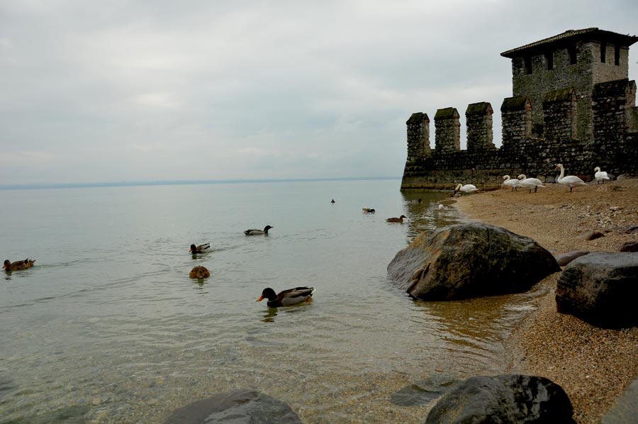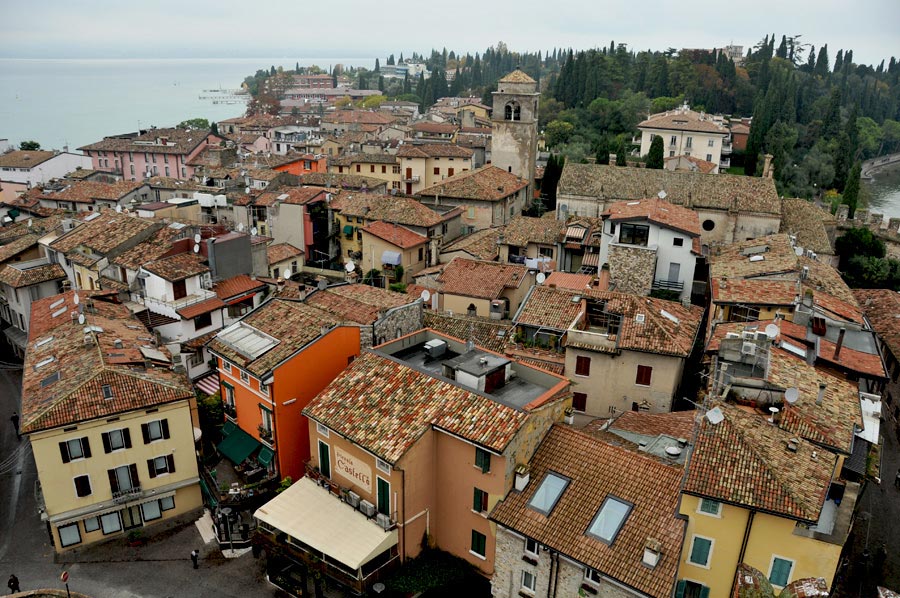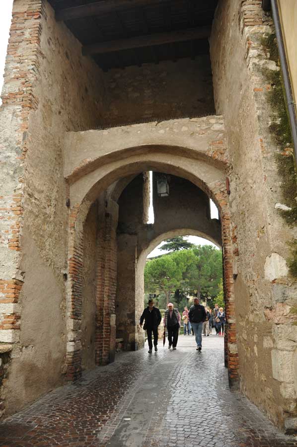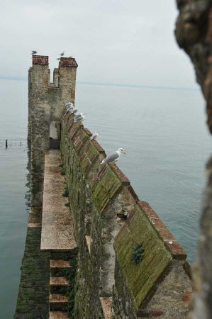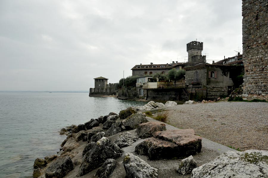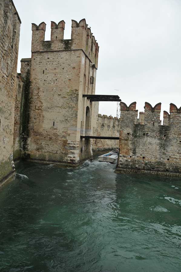 Gleich mehrere Zugbrücken, eine Ringmauer und zwei Hafenbecken trennten die Scaligerburg und damit diesen Stadtteil Sirmiones vom Festland ab. Der Klan der Scaliger baute aus dem seiner Zeit nur noch aus Ruinen bestehenden alten Römerkastell ab 1259 auf dem ersten der drei Hügel diese schon wehrhaft aussehende Burg mit den typischen Schwalbenschwanzzinnen, die direkt am Wasser liegt und dem innen liegenden Hafen einst der Gardasee-Flotte Schutz bot.