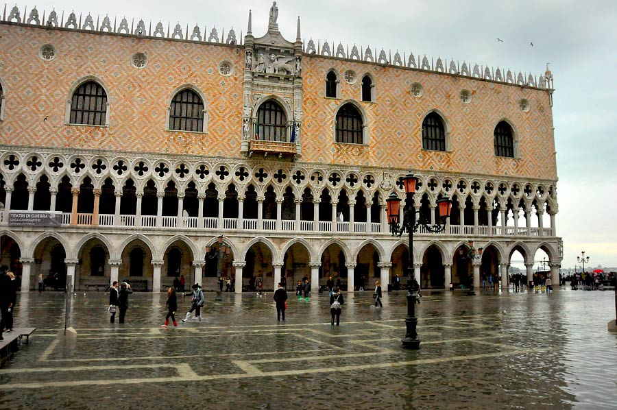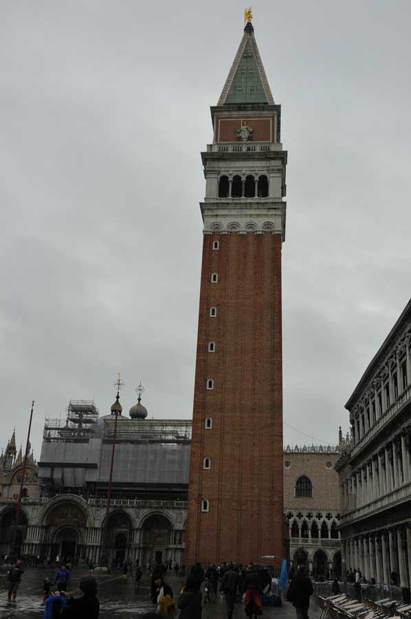 Der Markusplatz ist einer der niedrigstgelegenen Punkte Venedigs. Bereits bei einem Tidenhub von 80–90 cm kann er unter Wasser stehen. Die Pflastersteine verschwinden, das Wasser spiegelt die Basilika wider – ein beeindruckender, aber auch herausfordernder Anblick.