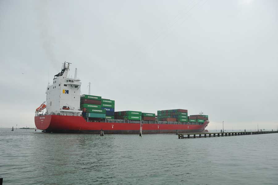 Das Strömungsverhalten von Ebbe und Flut wurde zusätzlich durch das Ausbaggern tiefer Fahrrinnen für die Überseeschiffe, die den Hafen von Marghera ansteuern, ungünstig beeinflusst, so dass Fundamente auch unterspült wurden. Später am Abend, wir waren auf dem Rückweg zum Campingplatz, konnten wir selbst eines dieser riesigen Feriendampfer erleben, das sich durch den Hauptkanal schob.