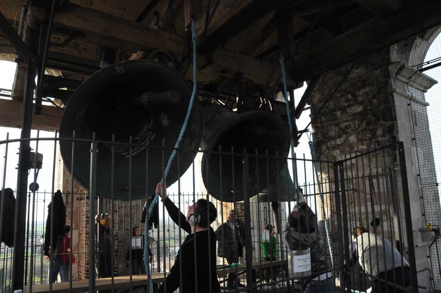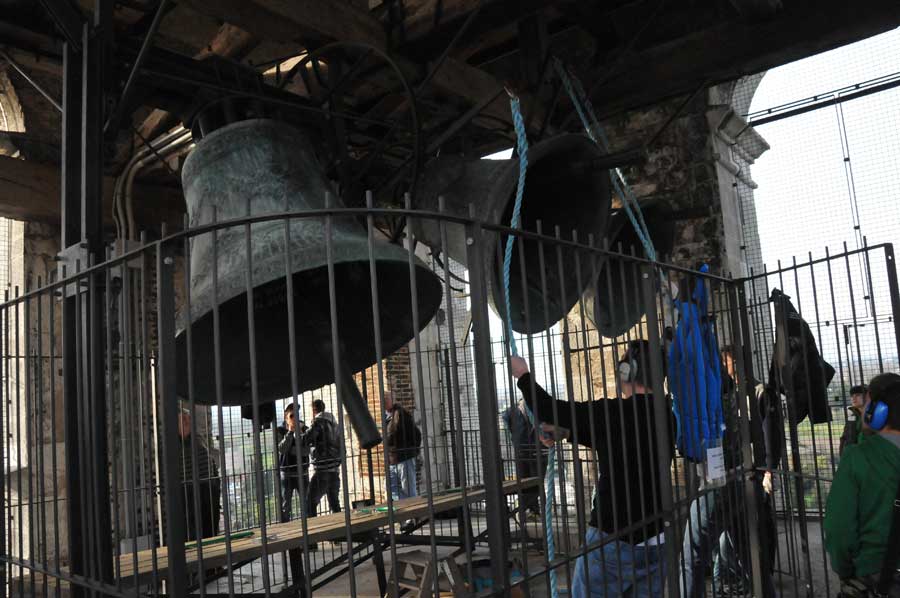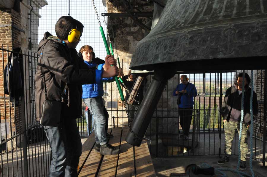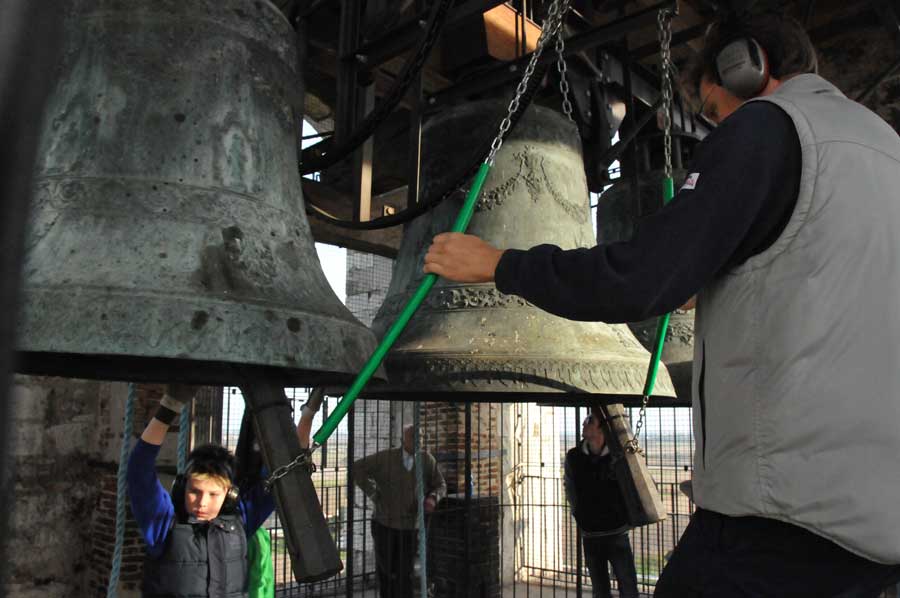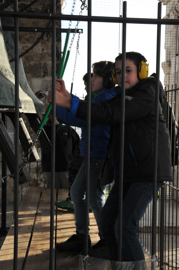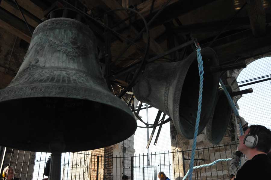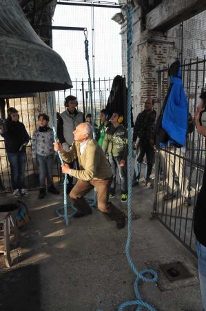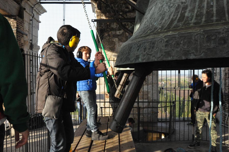 Dann wurden wieder die Größeren aktiv und spannten erneut die Seile zum Bewegen der Glocken. So gab es ein fast einstündiges Konzert der riesigen Glocken, das wohl weit ins Land hinaus zu hören war. Trotz des Gehörschutzes waren die Aktionen der Älteren sicherlich auch noch in vielen Kilometern Entfernung zu hören. Ob das samstägliche Glockenspiel bei allen beliebt ist, konnten wir leider nicht erfahren. Erstaunlich allein schon die Jugendarbeit, die sicherlich auch als eine Empfehlung in anderen Ländern gelten kann.
