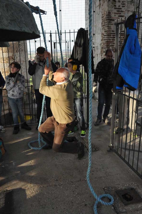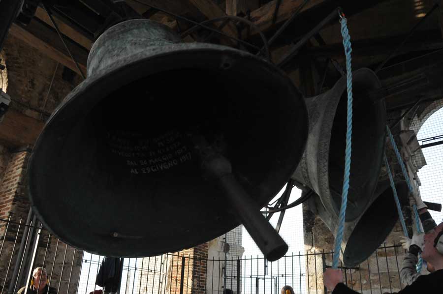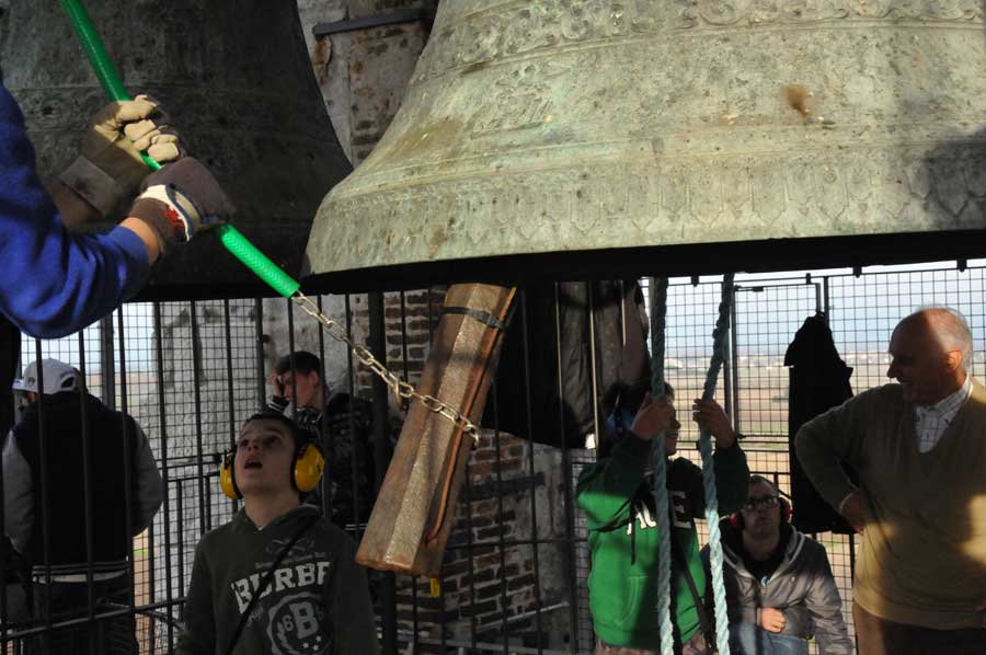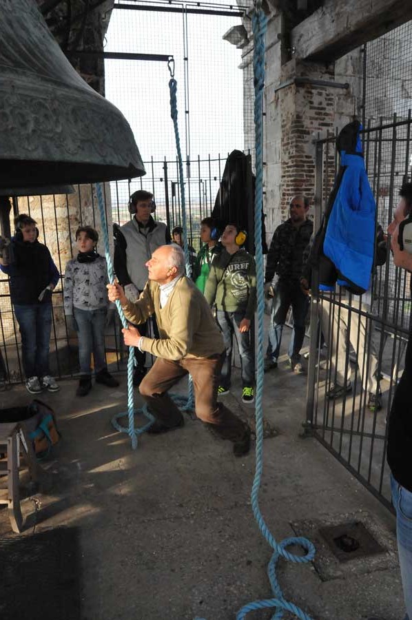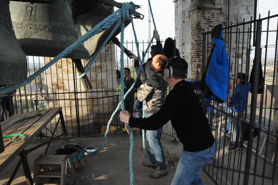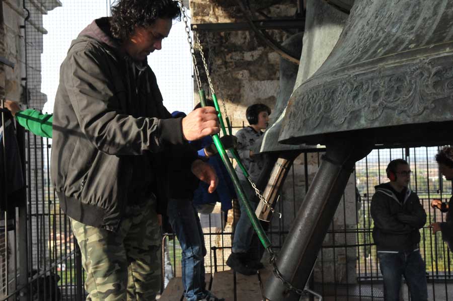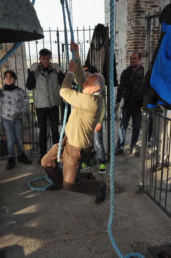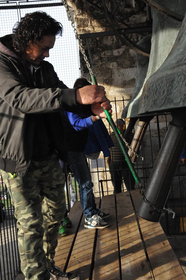 Dann wechselte die Szenerie, denn jetzt wurden die Klöppel im geringen Abstand zur Glocke fixiert. Auch das "Bedienpersonal" von Aquileia wechselte und nun waren die ganz jungen Glöckner dran. Sie nutzen die Seile mit denen der Klöppel fixiert war, um durch Ziehen daran quasi wie ein Schlagwerk den Klöppel gehen die Glocke schlagen zu lassen. Jetzt war die Nutzung der riesigen Glocken einem wirklichen Glockenspiel sehr nahe. So wurden verschiedenste Melodien gespielt, die mit viel Training eingeübt worden waren. Auch hier gab es stetigen "Personalwechsel".