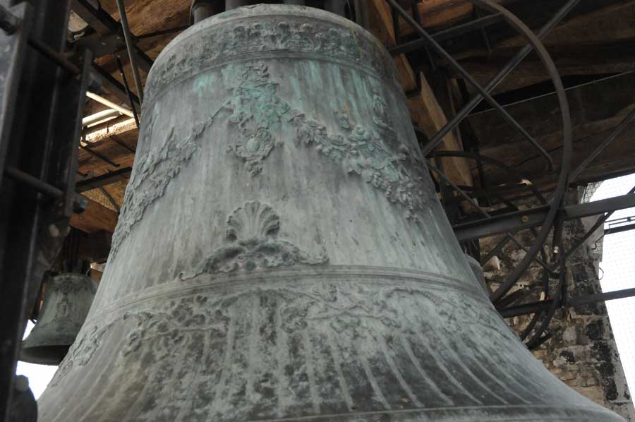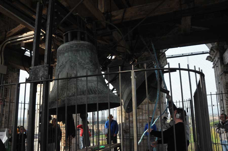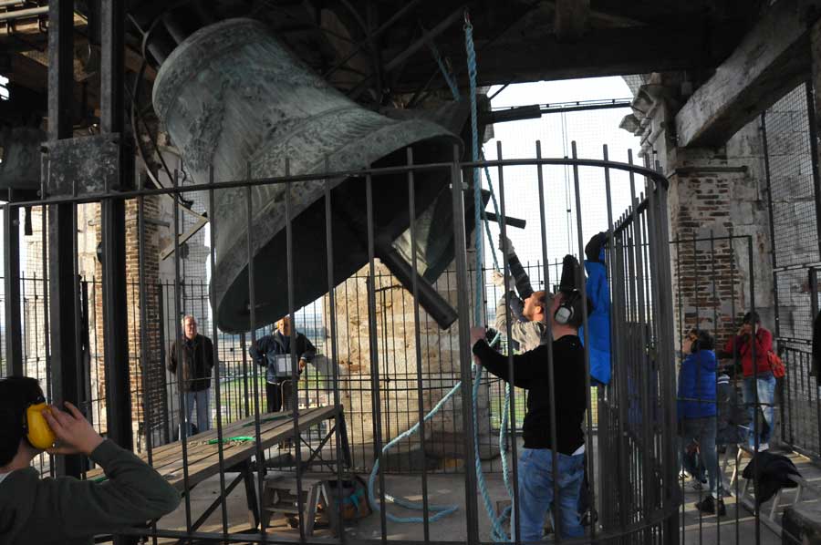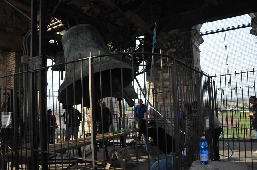 Dabei war gleichzeitig der erste Glockenschlag zu hören. Noch kurz anzumerken ist, das jeder der Anwesenden Hörschutz trug und man auch uns damit versorgt hatte. Jetzt folgte bereits eine weitere Erläuterung von Francesco: Die Frequenz der Anschläge (gemessen in Anschläge je Minute) ist von der Masse der Glocke und des Joches, deren Schwerpunkt, dessen Abstand zur Lagerachse und dem Läutewinkel abhängig ist. Folglich werden Schäden an Glockentürmen oftmals durch Resonanzen hervorgerufen, die sich aus der Nähe der Läutefrequenz einer Glocke zur Eigenfrequenz des Turmes ergeben und die zu Turmschwankungen von mehreren Millimetern führen können. Oft wird in solchen Fällen das Joch mit zusätzlichem Gewicht versehen (man spricht dann von einem „überschweren“ Joch), um die Glocke zu verlangsamen.