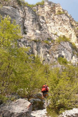 Zustieg zur Felswand: Bei einer großen Übersichtstafel an der Straße beginnt der anfangs gepflasterte Weg 404 zur Bastione (211 m). Von der weißen Festung auf dem Steig weiter bis zur Capanna (Hütte auf 560 m). Von der Hütte in Richtung Kapelle S. Barbara, vor einem Tunnelloch zweigt rechts der markierte Weg (404 B) zum nächsten Einstieg ab.
