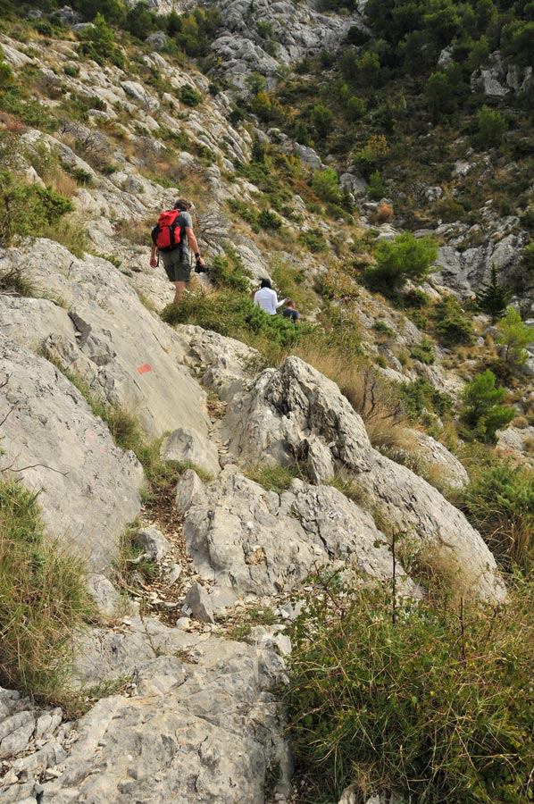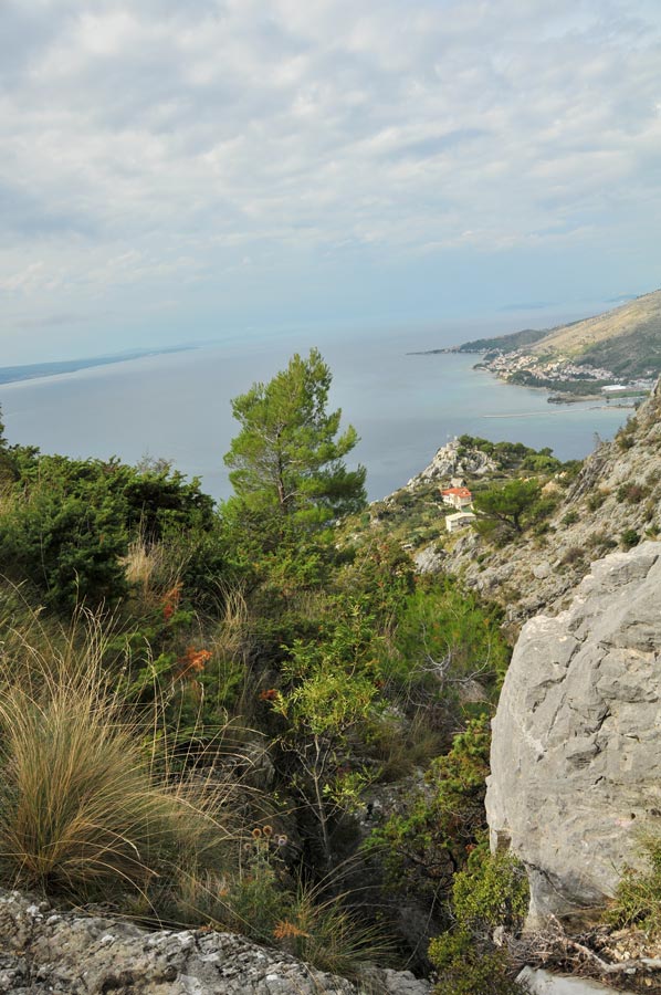 Gemeinsam machten wir uns dann auf den Weg zum vor Jahren eingerichteten Take-Off Platz oberhalb von Omis, der zunächst mit dem Auto bis zur Siedlung der uralten Steinhäuser führte, auf die wir bereits während der Wanderung zur Berghütte gestoßen waren. Jetzt folgten wir allerdings nicht dem gekennzeichneten Wanderpfad, sondern folgten einem Pfad, der zunächst durch Buschwerk führte.