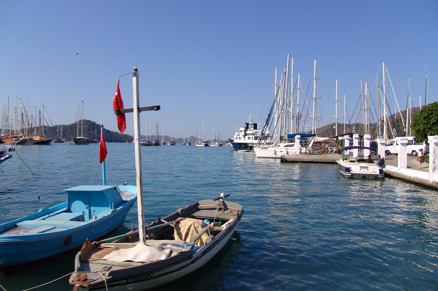 Auch stand der Bus schon auf dem Parkplatz und viele Schüler saßen in ihm. Heute fuhren Ralf, Hakan und ich mit dem Bus, während die Damen im Wagen des Schulleiters nach Göcek gebracht wurden. In Göcek, das hinter Fetiye liegt, setzte uns der Busfahrer in der Nähe des Hafens ab. Während die Schüler schon in Richtung Marina gingen, machten wir einen für uns überraschenden Besuch beim Bürgermeister von Göcek. Dies war uns in den leichteren Ausflugssachen etwas unangenehm, aber der Bürgermeister akzeptierte unsere Entschuldigung dafür.
