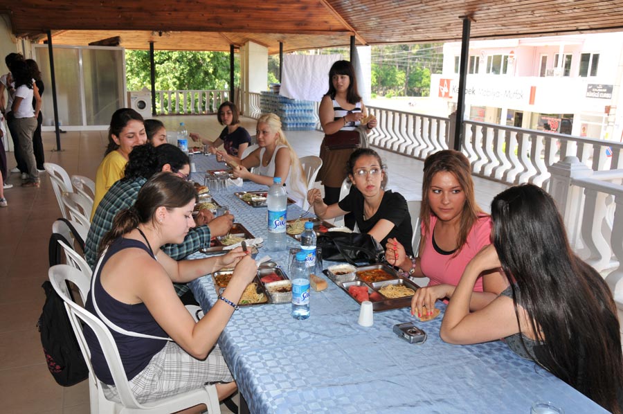 Nach dieser Besuchsrunde setzten wir Perihan und Yesem in der Nähe ihrer Wohnung ab, da sie noch einkaufen wollten. Heute Abend waren wir bei ihr zum Essen eingeladen. Unsere Pause war deshalb gar nicht so lang, da wir gegen Abend Malte Jöris vom Flughafen abholen wollten. Hakan hatte auch etwas von uns mitgewaschen, was wir zuerst gemeinsam aufhängten. Dann duschten wir und setzten uns ins Wohnzimmer, wo wir die ersten Filme zur Sicherheit auch auf meinen Rechner überspielten. Über die Flughafenseite von Dalaman erfuhren wir, dass der Flieger Verspätung hatte, so dass wir erst gegen viertel vor acht los fahren mussten. Ralf überbrückte die Zeit mit Gitarre spielen, während ich etwas schrieb. Teilweise bleibt so wenig Zeit zum Schreiben, dass ich oft erst abends spät beginnen kann, dann bin ich aber meist zu müde. Hakan informierte die Gasteltern von Malte, dass sie ihn am Busbahnhof abholen könnten, wir würden ihn bis dort mitnehmen. Durch die Kontakte von Hakan durften wir direkt vor der Abflughalle parken. Dann ging es zur Ankunftshalle, in der wir zuerst warten mussten. Dann kam ein Polizeioffizier, ein ehemaliger Schüler von Hakan, und ließ uns in den Sperrbereich. Endlich entdeckten wir einen strahlenden Malte im hinteren Bereich der Halle und bald schlossen wir ihn in unsere Arme. Sein Flug mit Condor war sehr angenehm. Da wir nicht auf Koffer warten mussten, konnten wir bald aufbrechen und schließlich inDalaman seinen Gasteltern und dem Austauschschüler übergeben. Da wir vergessen hatten, den Koffer von Malte mit zu nehmen, fuhren wir kurz zurück und händigten ihm den Koffer aus. Inzwischen war es nach neun und wir sollten jetzt in Dalaman Mehmet bei einer Druckerei abholen, doch dort war er nicht mehr. Nach so viel Kurverei freuten wir uns auf das Abendessen bei Yesem, das aus vielfältigen leckeren Speisen bestand. Perihan und Yesem verwöhnten uns an diesem Abend mit ihren Rezepten.