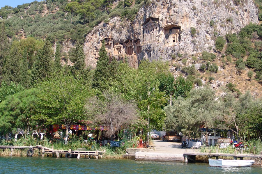 Endlich saßen alle im Bus und die Fahrt konnte los gehen. Wir fuhren mit dem Auto hinterher, was uns etwas erstaunte, da wir sonst immer bei Ausflügen mit den Schülern zusammen im Bus sind. Unterwegs holten wir in einem Nachbarort Ortaca noch Schüler ab und später kamen in Dalyan weitere dazu, die hier bei ihren Gastschülern wohnen. Im Touristenort Dalyan, in dem wir vor einem Jahr untergekommen waren, war diesmal viel mehr los.