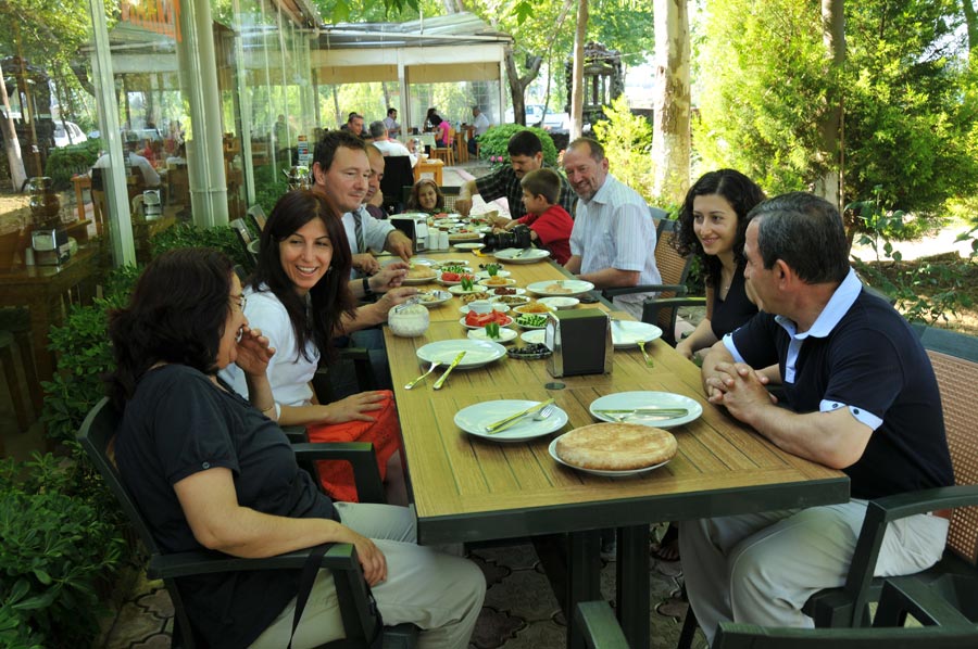 Unter einigen Mädchenpaaren gab es Spannungen, die teilweise mit mangelnder Kommunikation, aber auch mit verschiedenen Mädchencliquen zu tun hatten. Wir bemühten uns die aufgetretenen Probleme anzusprechen und nach Lösungen zu suchen. Dann konnten auch wir uns zu Hakans Haus begeben und eine kleine Pause einlegen. Ralf nutzte sie zu einem kleinen Lauf, Hakan besuchte seine Mutter und ich schrieb am Tagebuch und einige Mails. Um acht Uhr waren wir in dem Restaurant verabredet, wo wir im letzten Jahr einen leckeren Fisch in der Salzkruste gegart gegessen haben. Auch diesmal gab es Fisch, diesmal aber gegrillt und diverse Vorspeisen. Wir genossen den warmen Abend mit türkischer Musik im Hintergrund von einer Feier mit Kindern.