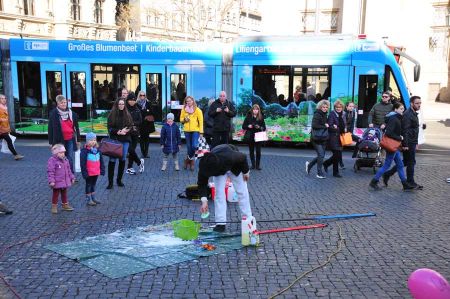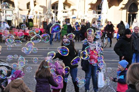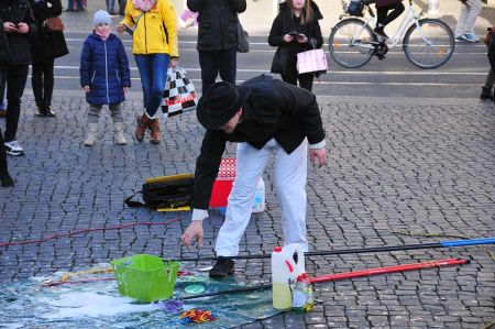 So stießen wir nach der Demo auf einen Seifenblasenartisten, der uns schnell mit seiner Kunst in den Bann ziehen konnte. Und nicht nur uns. Eine Gruppe von Passanten hatte sich bereits auf sein Spiel eingelassen, darunter zahlreiche Kinder, die mit den Händen versuchten, die Seifenblasen zu fangen. Ein faszinierendes Spiel. Hin und wieder wurden die Gerätschaften gewechselt, so dass der Künstler riesig große Seifenblasen schuf, die vom Publikum begeistert begrüßt wurden. Ein Farbenspiel in der jetzt schon tief stehenden Abendsonne.