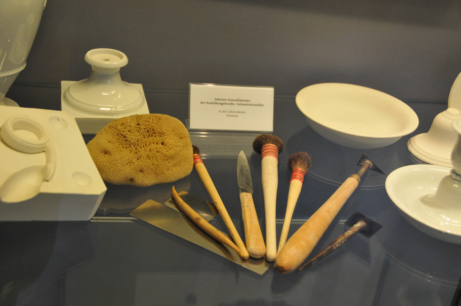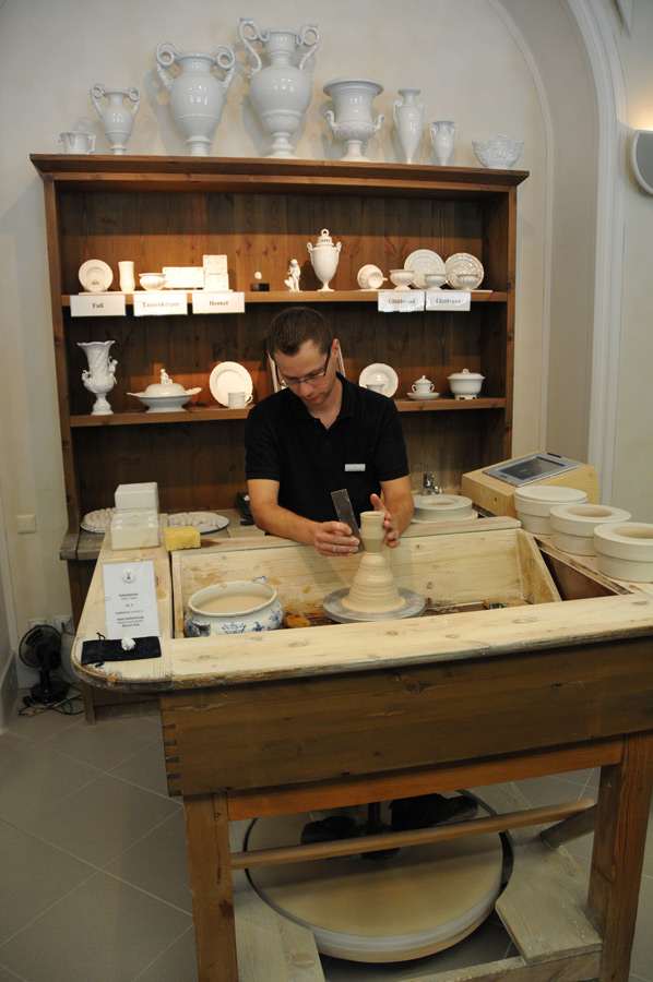 Im folgenden Raum werden einige Details zum Material selbst und den Herstellungsverfahren erläutert. Natürlich werden hier keine Rezepturen verraten, denn die sind logischer Weise Betriebsgeheimnisse. Sehr anschaulich führt ein junger Angestellter die grobe Fertigung einer Tasse vor, die aus der Rohmasse per Hand gedreht wird. Verschiedene Modelle sorgen dann für die End Form der Tasse. Sehr deutlich sind dann allein die Größenunterschiede zwischen Fertigung und erstem Brand zu erkennen. Allein hier beginnt die Kunst in der Porzellanherstellung: Brand des Geschirrs ohne Risse und sonstige Beschädigungen.