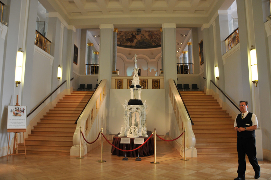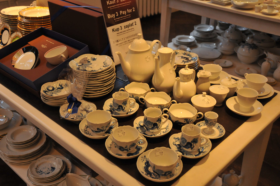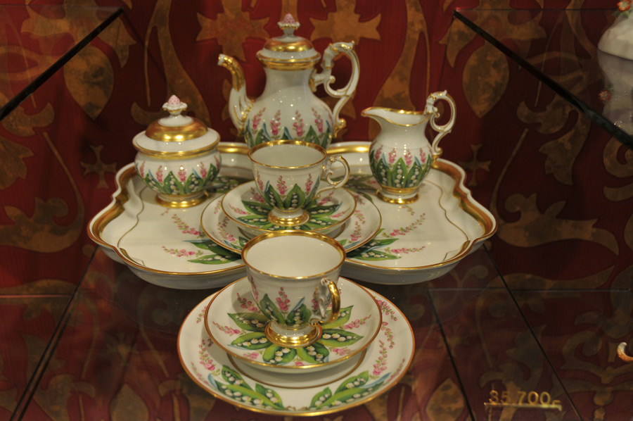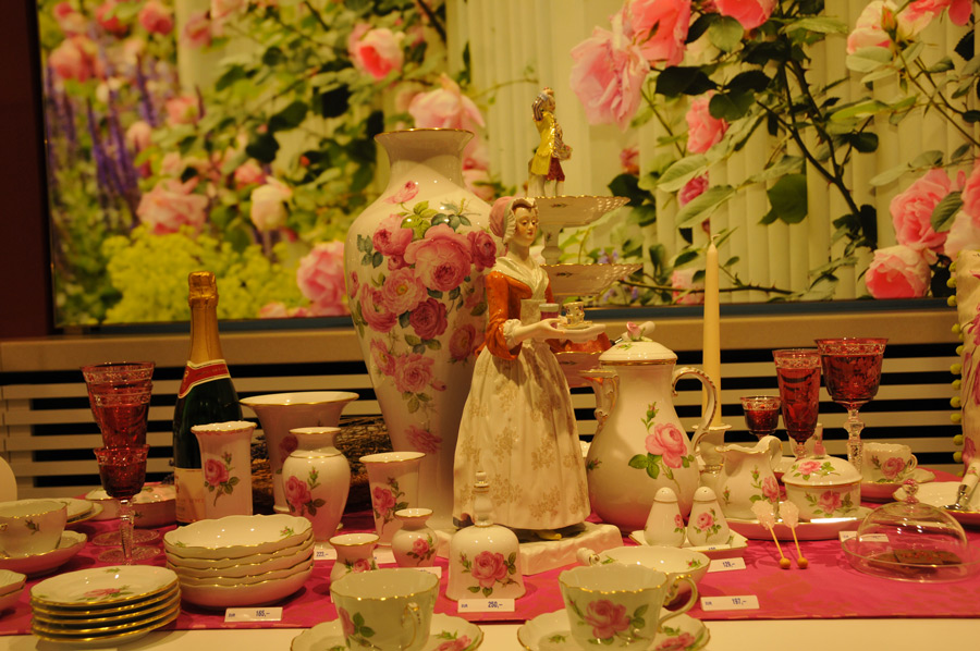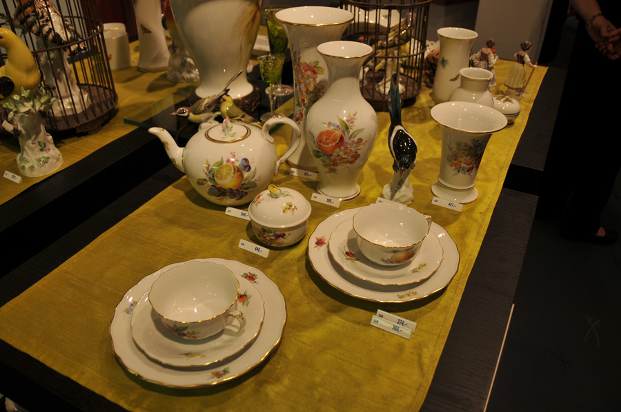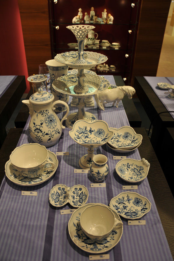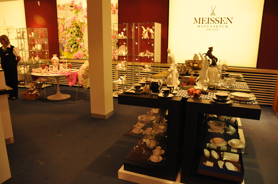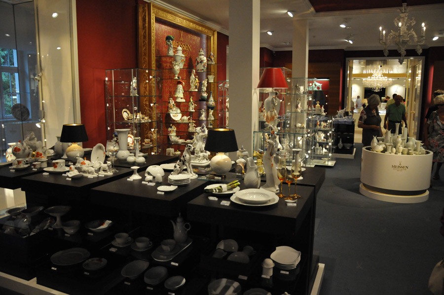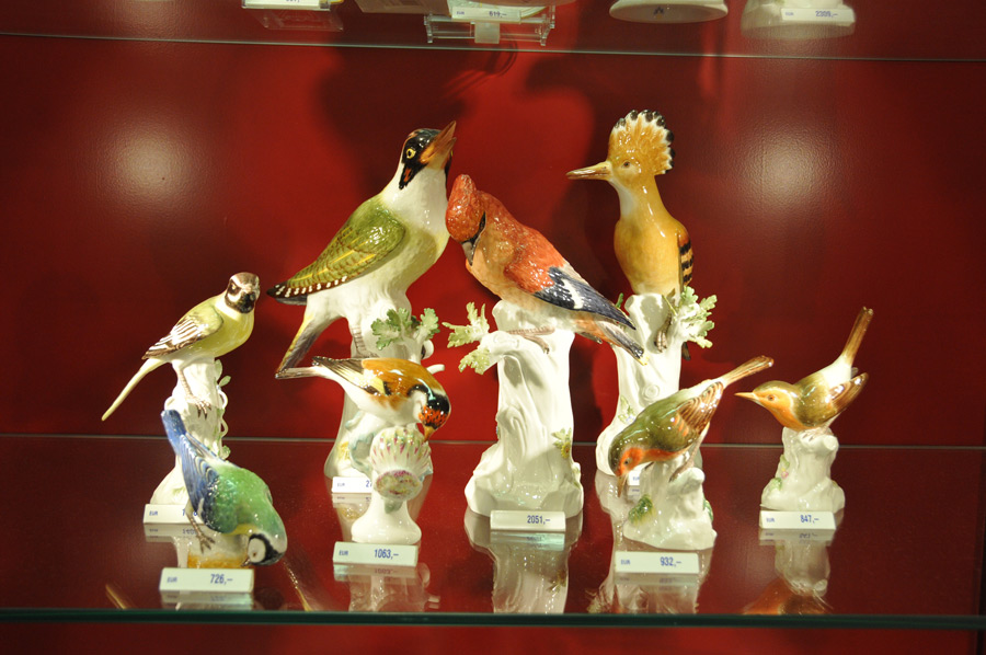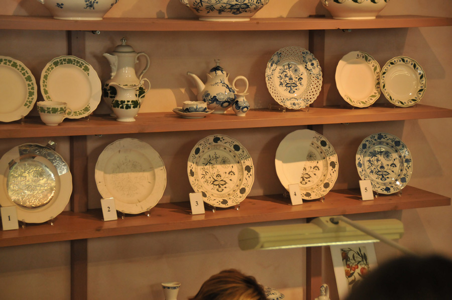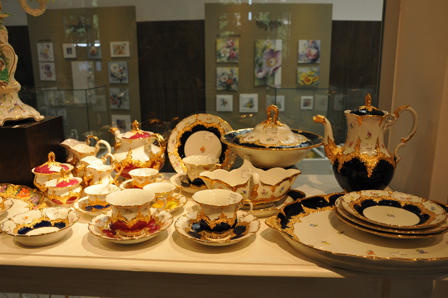 Wir betreten diese so bedeutenden Räume der Meissener Manufaktur mit einer gewissen Ehrfurcht, denn allein aus der Familie sind Sammlungen des Geschirrs mit den gekreuzten Schwertern und der mit ihnen verbundene Wert durchaus bekannt. So gelangen wir denn auch schnell in die ersten Ausstellungsräume, die riesigen Zahlen an Kaffee- und Essgeschirr der bekannten Designs zum Verkauf anbieten. Unser Rundgang führt uns über Ausstellungen reinen „Gebrauchsgeschirrs“ schnell auch zu den kunstvollen Fertigungen des Geschirrs für die etwas besser situierten Menschen unserer Gesellschaft. So sind dankenswerterweise preislich gekennzeichnete Stücke zu sehen, die leicht den Wert eines Mittelklassewagens übersteigen. Es folgen Vasen, dekorative Assessors für die Vitrinen, kunstvolle Wandbilder aus weißem Porzellan, Masken und Figuren, die wohl als einmalig zu gelten haben.