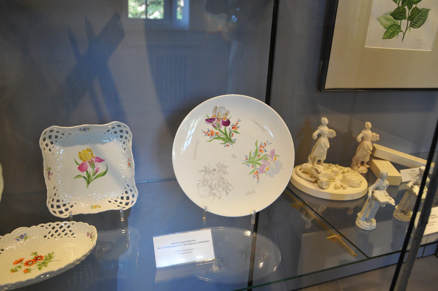 Als letzter Vorführungsraum gelangen wir in die Porzellanmalerei. Auch hier sitzt eine aktive Mitarbeiterin, die anhand eines Tellers ihre zu erledigende Arbeit erläutert. Allein der Farbauftrag von Hand nimmt auch hier die volle Aufmerksamkeit des Malers in Anspruch. Vorgezeichnete Strukturen auf dem glatten Porzellan helfen den Ausführenden natürlich beim Auftrag der Farben. Allerdings muss auch die vorgezeichnete Struktur zunächst händisch aufgetragen werden. Jedes Porzellanwerkstück ist also wirklich echte Handarbeit.