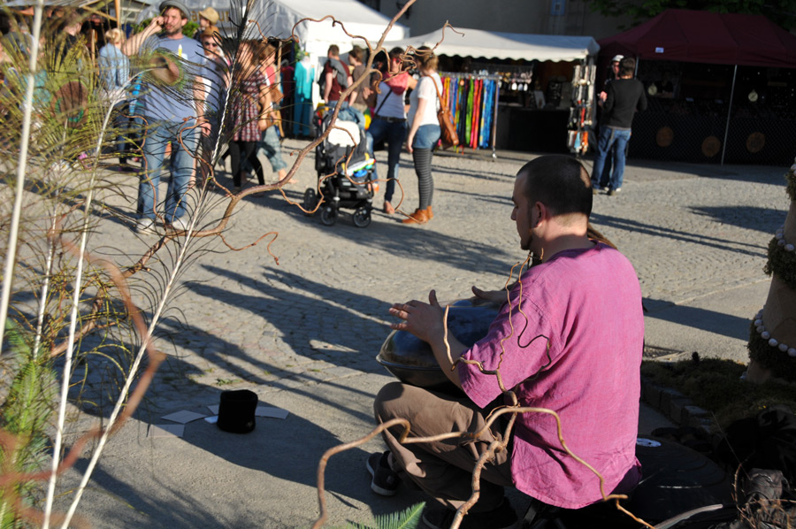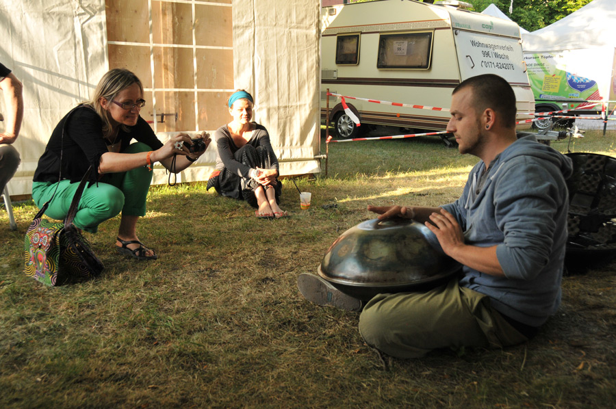 Erst beim Näher kommen war auch der Grund für die Ansammlung deutlich geworden, denn fast scheu, zumindest im Vergleich zu den großen Bühnen des Grenzenlos Festivals, waren hier die leisen Töne eines Instruments zu hören, das die Menschen wie verzauberte. Alle Hektik war verflogen, Ruhe und Gelassenheit in allen Gesichtern rundum.