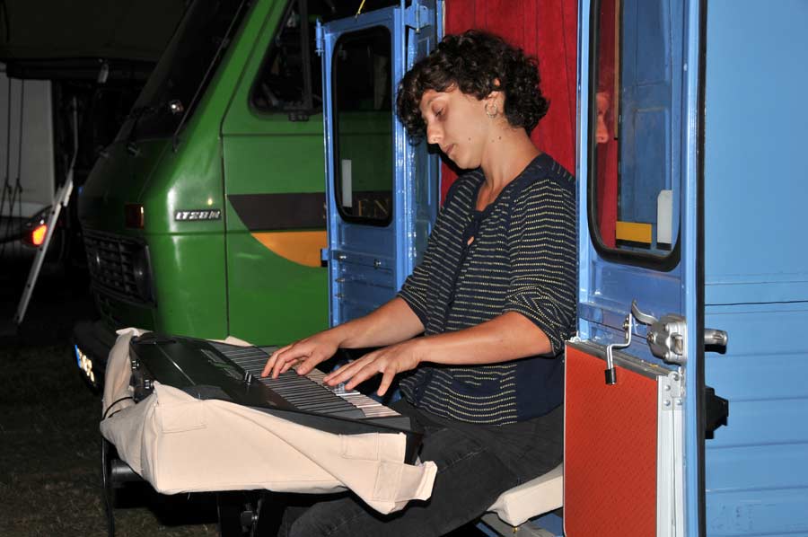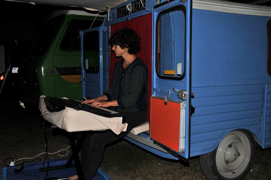 Schon am Nachmittag war Judith mit einigen Aktionen beschäftigt, die wir zunächst nicht deuten konnten. Wenig später sollten wir dann sehen, was sonst noch so in dem schon erwähnten "Großraumfahrzeug" Kastenente 2CV untergebracht war: die Sitzbank war so gestaltet, dass in ihrem Unterbau ein elektronisches Piano eingeschoben werden konnte. Dieses hatte Judith nun aufgebaut und einige musikalische Grundübungen mit dem Kopfhörer durchgeführt. Bei einem Kaffee, den wir in ihrer Pause anboten, erklärte sie uns, das es dringend Zeit war, wieder einige Übungen am Piano durchzuführen. Wenige Augenblicke später schon war die Idee zum abendlichen Konzert auf dem Campingplatz geboren.