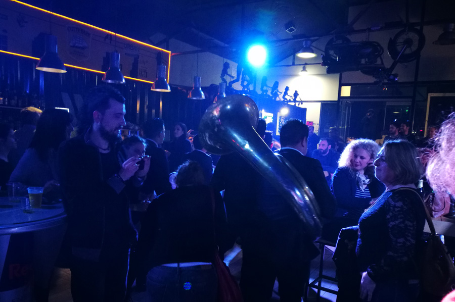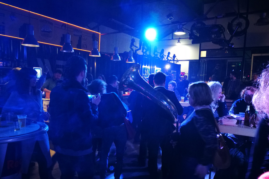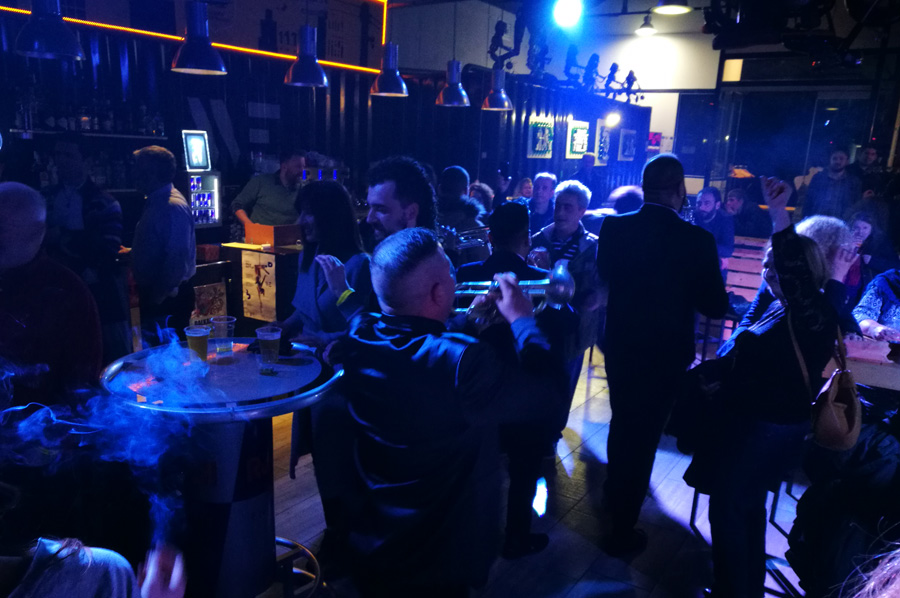 In einem Nebenraum hatte sich die Mitglieder des Ensembles versammelt, um dann, für das Publikum überraschend, sich den Weg durch das Publikum bis mitten dazwischen zu suchen, wo sie dann als Pausenuntermalung erste ihrer Stücke zum Besten gab (währenddessen wurden auf der Bühne die Umbauten für die Thrax Punks vorgenommen).