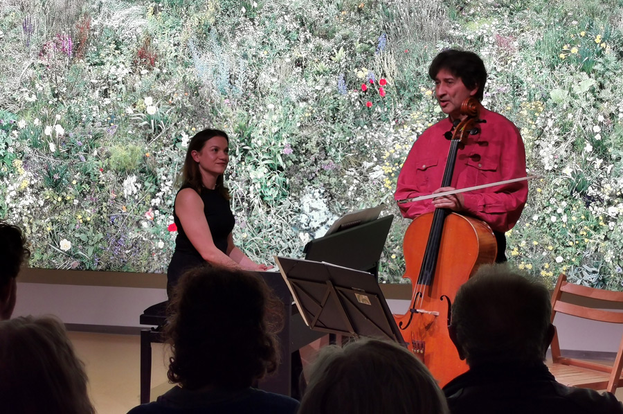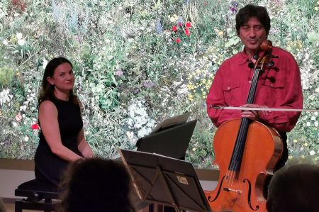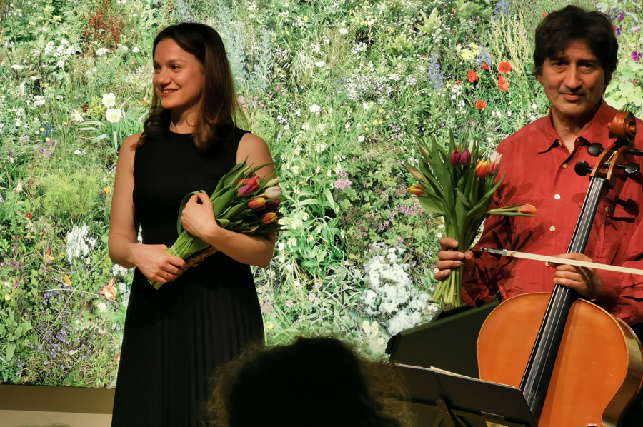 Der außergewöhnliche Ort und der außergewöhnlicher Hintergrund (siehe Hintergrund Bild von Hiroyuki Masuyama) für ein musikalisches Event hatten auch für unser Interesse gesorgt, einem Piano / Cello Konzert von Margarita Mikhnievych (Piano) und Peter Sarkar (Cello) in der Galerie Rothamel in Erfurt.