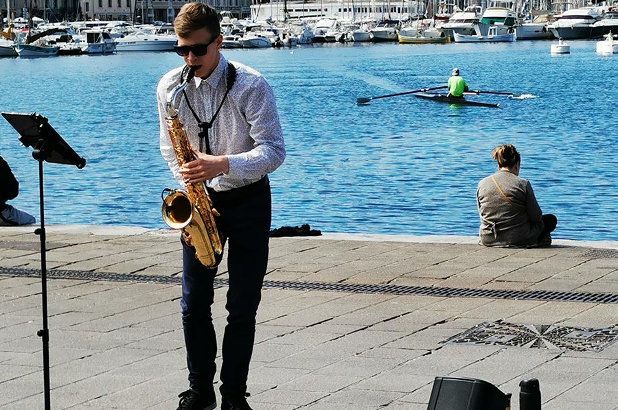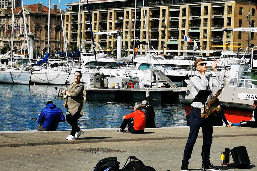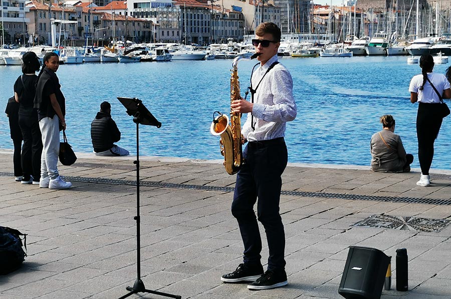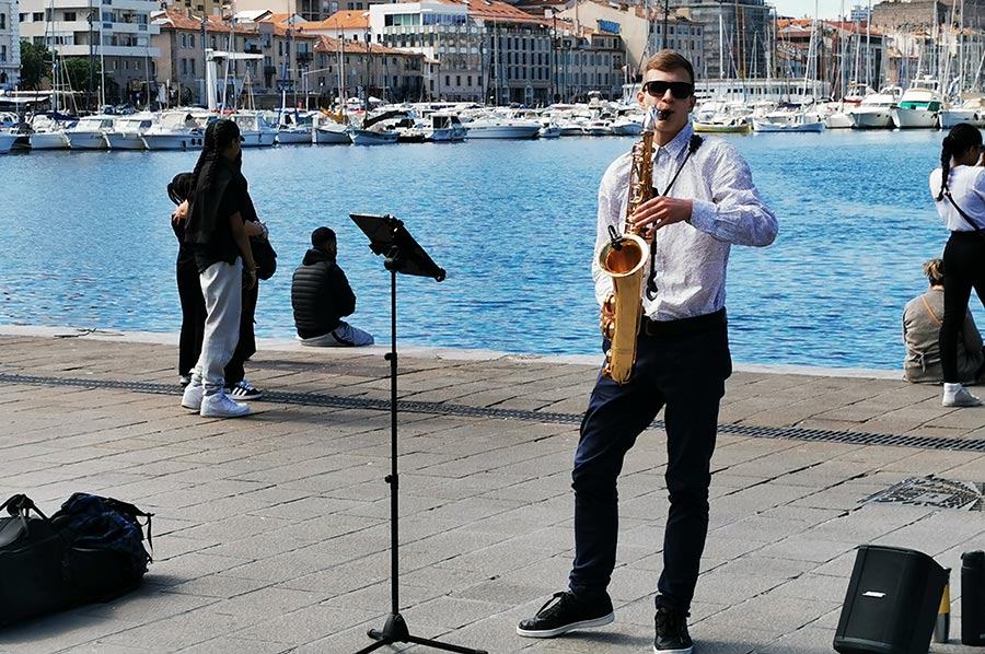 Straßenmusiker bevorzugen verständlicherweise stark frequentierte Orte, zum Beispiel öffentliche Plätze wie am Hafen Vieux Port, aber auch Einkaufsstraßen, Fußgängerzonen, touristische Sehenswürdigkeiten oder sogar öffentliche Verkehrsmittel.