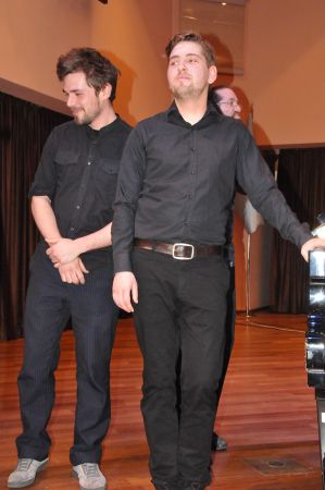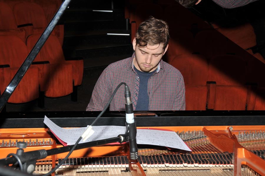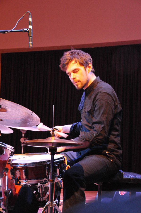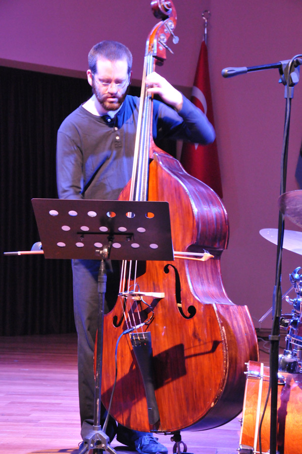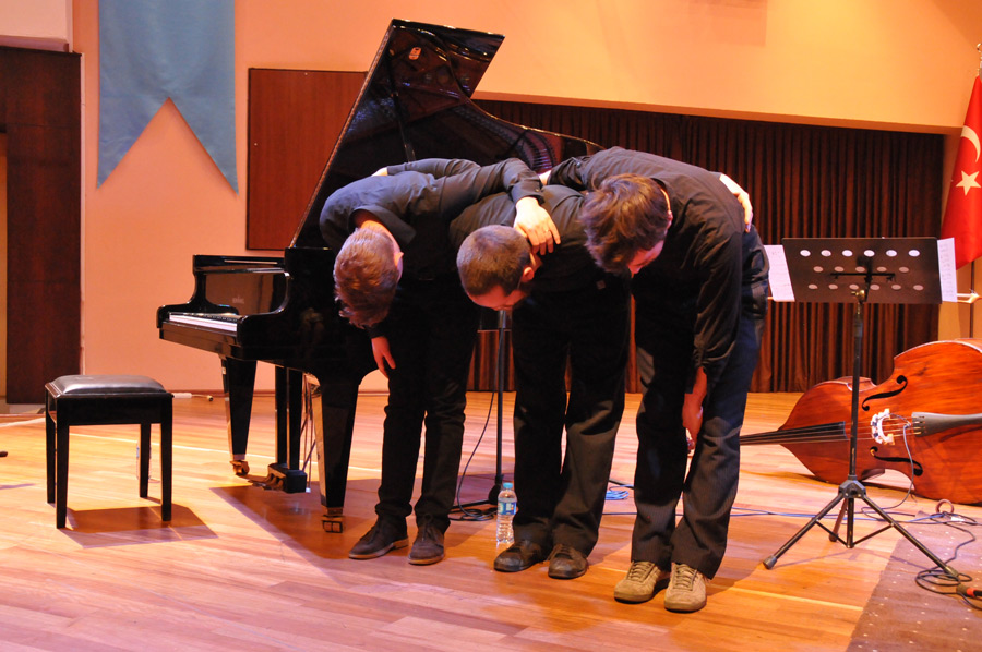 Schon am Nachmittag konnten wir der kurzen Probe des Pablo Held Trios beiwohnen, die auf der Bühne der Atatürk Konferenz Halle auf dem Gelände der Akdeniz Universität stattfand. Das Pablo Held Trio besteht aus dem Pianisten Pablo Held, dem Bassgeiger Robert Landfermann und dem Schlagzeuger Jonas Burgwinkel, die alle aus der Region um Köln stammen. Im Aufbau der Bühne hinsichtlich Instrumentierung und Lichtanlage der Gruppe organisierte das Goethe Institut die benötigten Instrumente in Form von Bassgeige, Schlagzeug und Flügel, Instrumente, die einfach zu sperrig gewesen wären um den Transport im Flugzeug zu gewährleisten. Lediglich einige benötigte Zusatzteile hatte der Schlagzeuger Jonas Burgwinkel selbst mitgebracht. Die Verstärkeranlage sowie das Licht wurden Hausintern geleistet und vom Techniker der Universität eingerichtet. Auch ein Klavierstimmer wurde noch kurzfristig herbeigerufen, so dass die Instrumente aufeinander abgestimmt werden konnten. Schon während der Probe war zu erkennen, dass es keine Abstimmungsprobleme der Musiker untereinander gab, denn schnell waren einige Stücke angespielt und passten. Wie von Profis auch nicht anders zu erwarten.