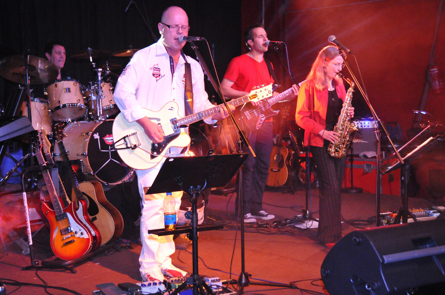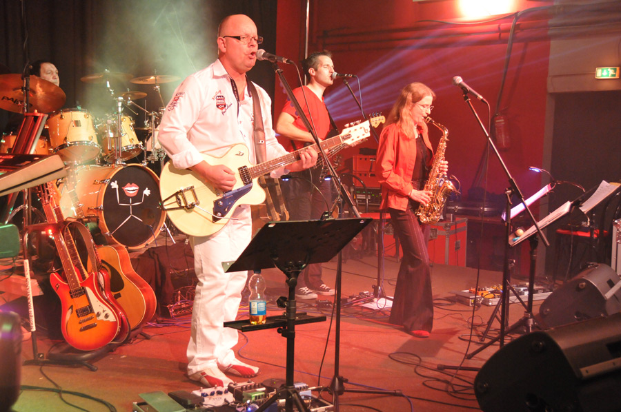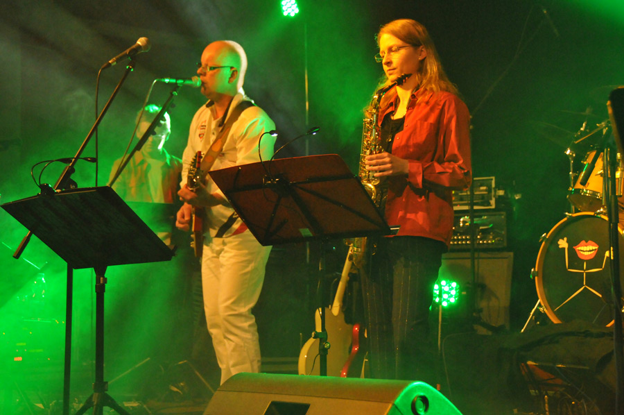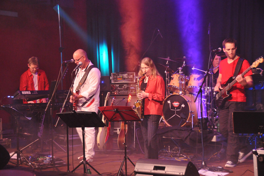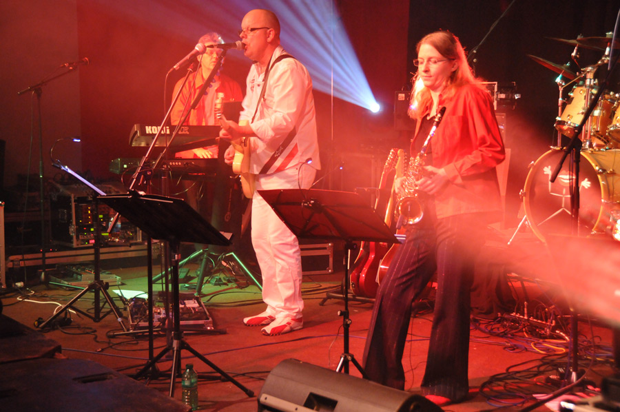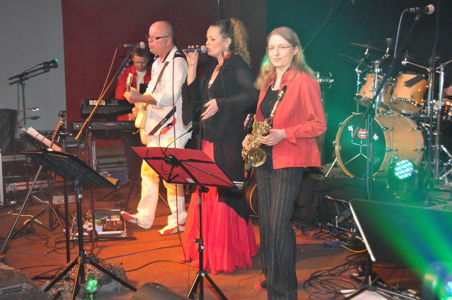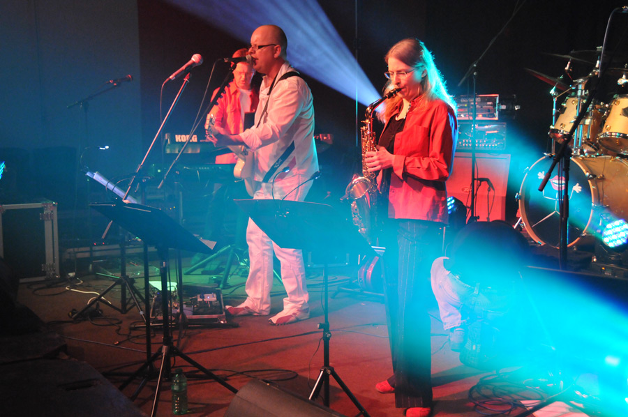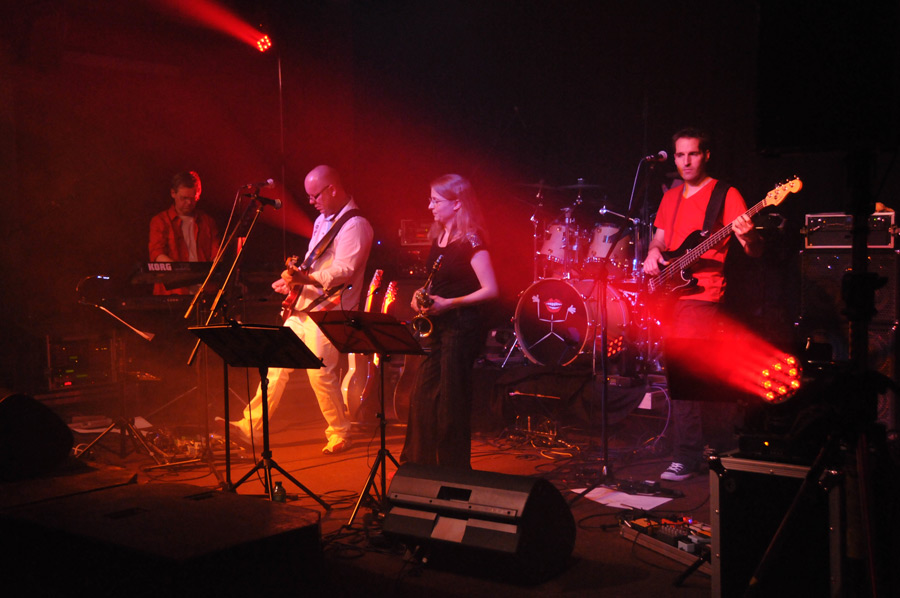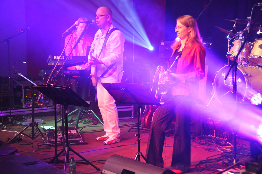 Der gesamte Soundcheck verlief außerordentlich professionell, kein Wunder, denn alle Beteiligte sind seit Jahren in der Branche tätig und verfügen über schnelle Auffassungsgabe und Verständnis für notwendige Kompromisse, die nun einmal bei Live Veranstaltungen notwendig sind. Gegen 20 Uhr füllte sich dann auch die Halle, die im hinteren Teil mit Biertischen und Bänken ausgestattet war. Über das KUKI Augsburg wurden Getränke angeboten, die von den geladenen Gästen und Fans der Band auch, trotz anfänglicher Kälte in der Halle, entsprechend frequentiert wurden. Nur wenig später waren die Bandmitglieder auf der Bühne angetreten und begannen den Abend mit ihrem Stück „First Touch“, einem der so vielfältigen und abwechslungsreichen, eigenen Kompositionen aus der Anfangszeit der Gruppe Backdoor Connection. Es folgten die Songs „Watching Eyes“, „Lost Boy“ und „Early Morning”, denen dann der erste Auftritt von Veronika Sax folgte.