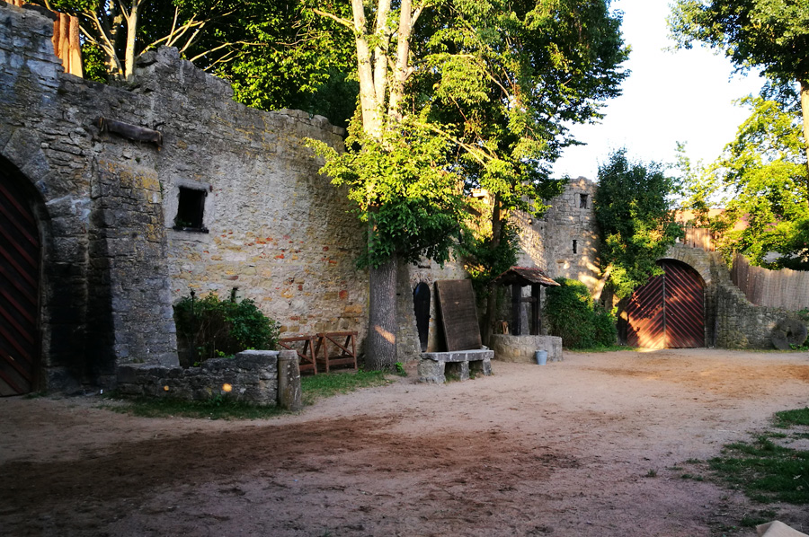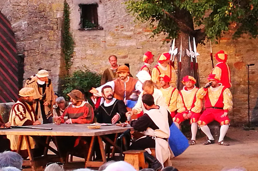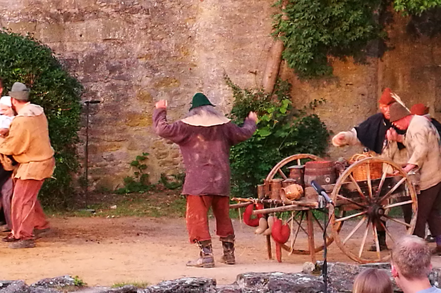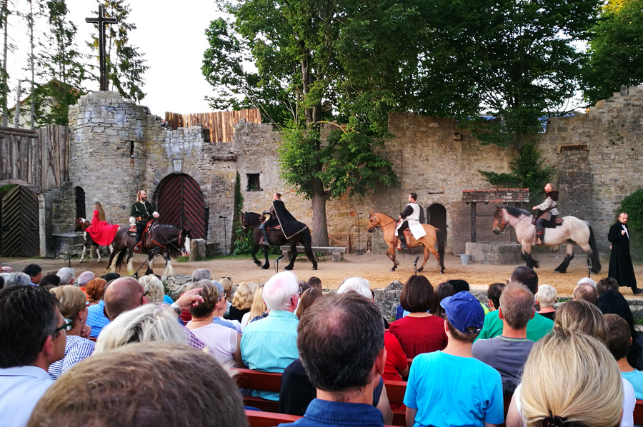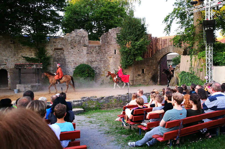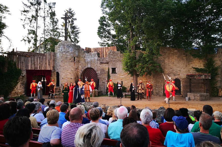 Einer der bekanntesten Vertreter der Familie war Florian Geyer, ein fränkischer Reichsritter, Truppenführer im Dienst des Markgrafen Albrecht von Brandenburg-Ansbach und Diplomat, der um 1490 geboren wurde. Er unterstützte die aufständischen Bauern während des Bauernkrieges finanziell und militärisch und übernahm im Bauernkrieg 1525 die Führung des so genannten Tauberhaufens. Dies ist im Groben der Hintergrund der Aufführung der Episode "Die Macht des Blutes" aus dem Leben des Ritters Florian Geyer, die wir im Freilichttheater in Giebelstadt erleben durften. Laienschauspieler aus dem Ort und der näheren Umgebung spielen die üblen Geschichten des grausigen Mittelalters um Intrigen und Komplette, um Unterdrückung und Ausbeutung in historischen Gewändern sehr farbenprächtig nach. Die Aufführung wird durch die immer wieder zum Einsatz kommenden Pferdepassagen wirklich zeitnah lebendig. Vielleicht einige weitere Details zur Hintergrundgeschichte: