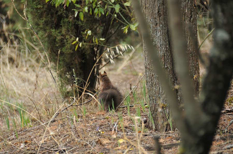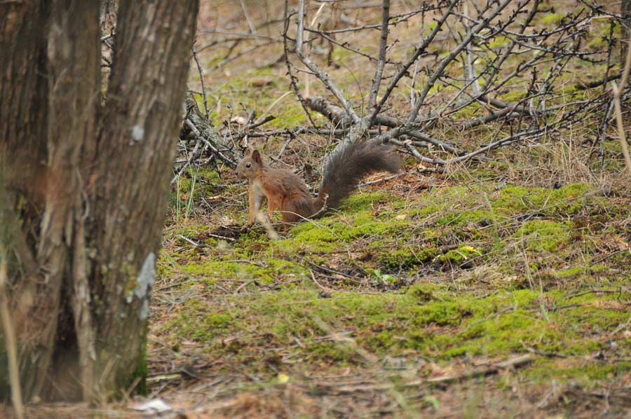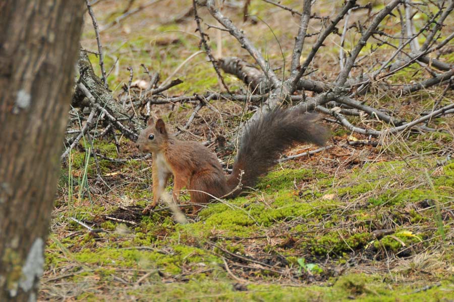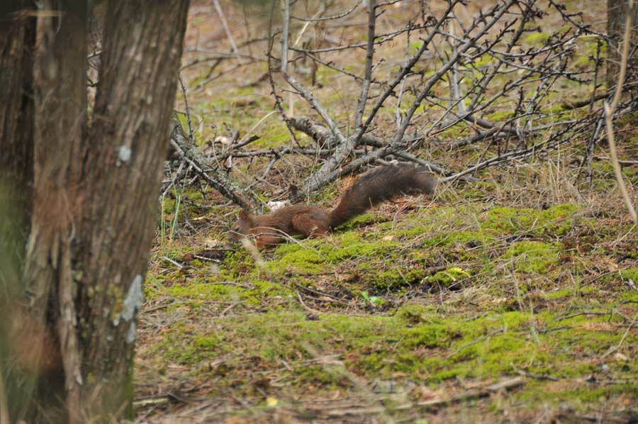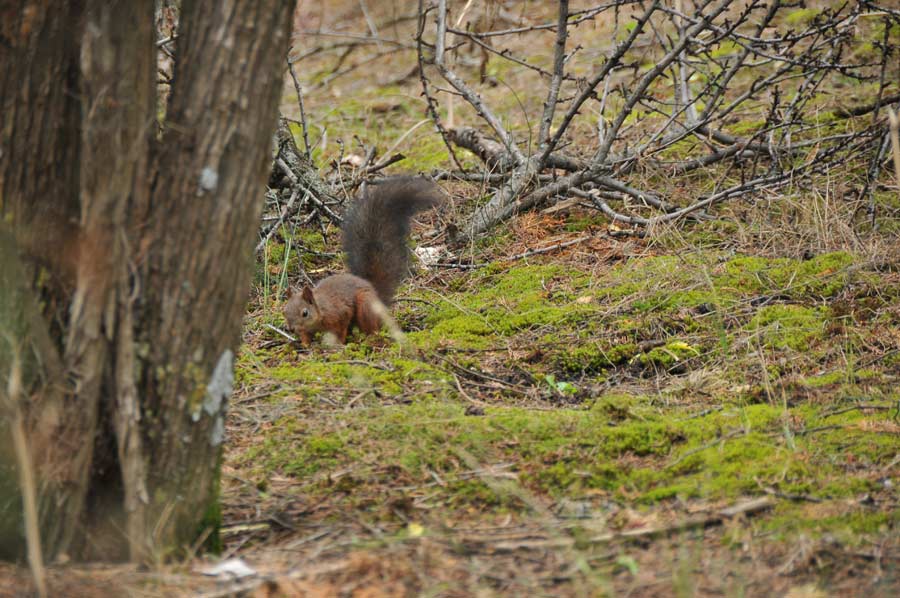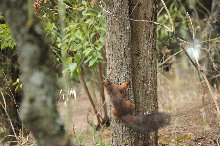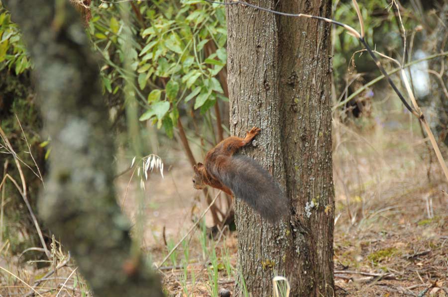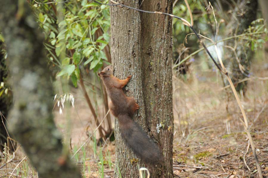 Eichhörnchen sind tagaktiv, wirklich sehr aktiv und schnell. Wir wollen Fotos, doch die Tiere klettern sehr geschickt und bewegen sich stoßweise voran, ihre Bewegungen sind sehr schnell und präzise, kaum eine gute Chance für ein Foto. Dabei spielt es keine Rolle, ob sie einen Baumstamm oder eine raue Hausfassade hinauf- oder mit dem Kopf voran hinunterklettern. Wenn sie abwärts klettern, drehen sie ihre hinteren Pfoten nach außen und hinten. Mit einem Sprung können die Tiere leicht Entfernungen von vier bis fünf Metern überbrücken. Eichhörnchen wagen sich wegen ihres geringen Gewichtes auch auf sehr dünne Zweige, dabei bewegen sie sich stets springend vorwärts und sind damit jedem Verfolger absolut überlegen.