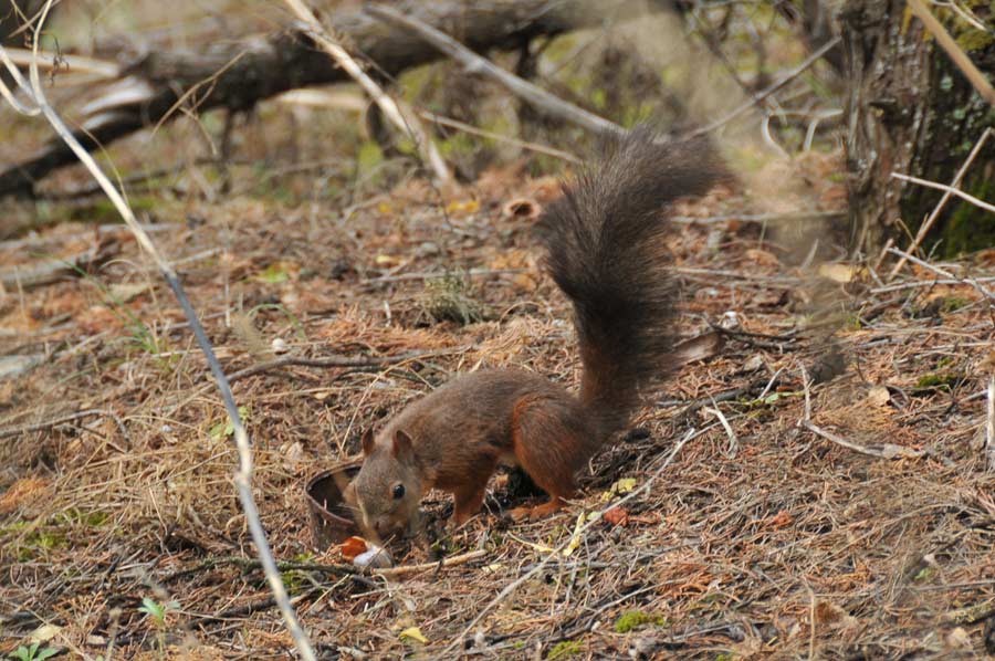 Eichhörnchen legen im Herbst Vorräte für den Winter an, unseres hatte eine Haselnuss gefunden. Dafür ist es wichtig, dass sie ausreichend Nahrung finden, um die Vorratslager zu füllen. Nicht immer gelingt dies, in den strengeren Wintern verhungern unter Umständen viele der Tiere. Sie vergraben die Nahrung entweder im Boden, oft in der Nähe von Baumwurzeln oder verstauen sie in Rindenspalten oder Astgabeln als Wintervorrat.